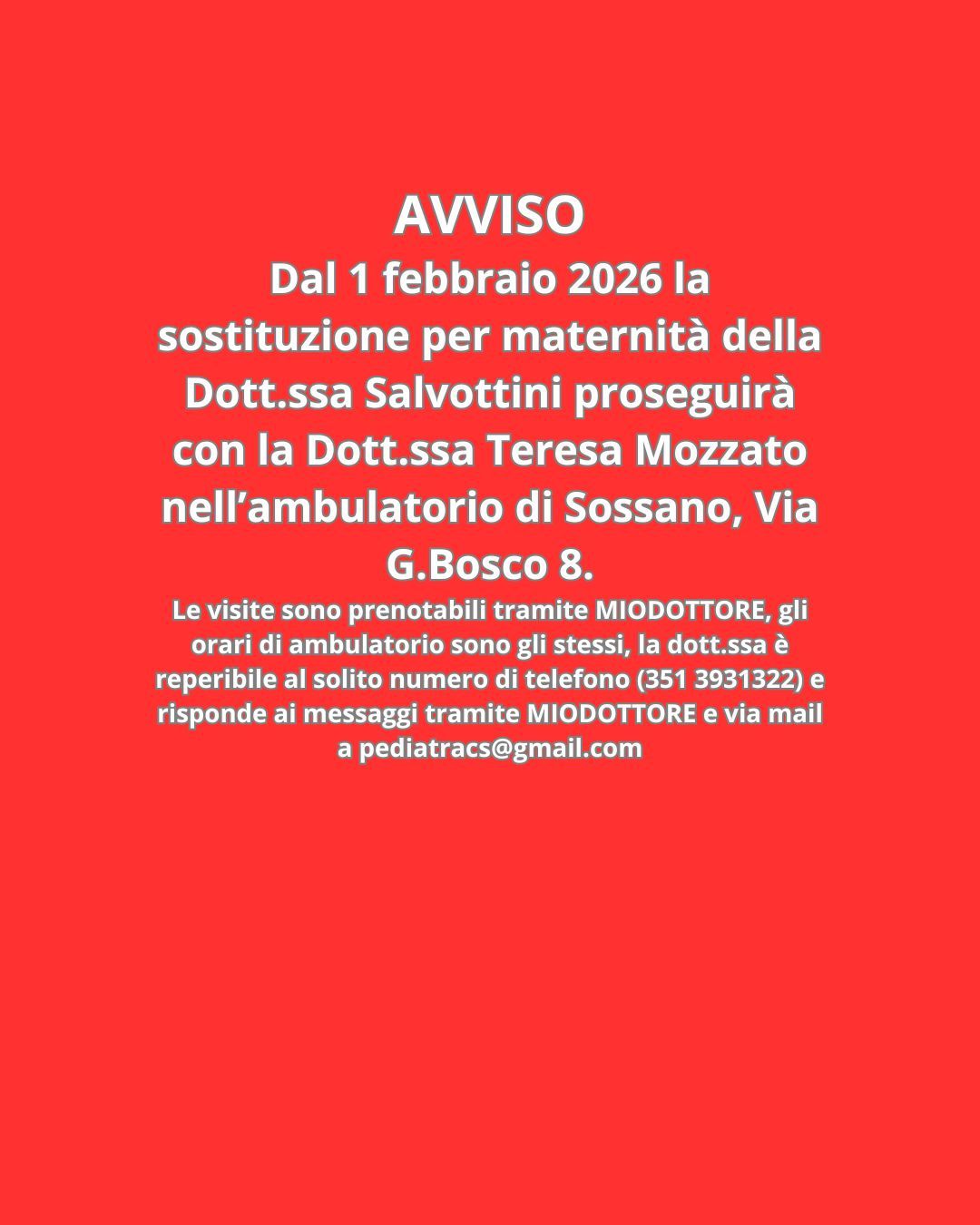 Dal 1 febbraio 2026 la sostituzione per maternità della Dott.ssa Salvottini proseguirà con la Dott.ssa Teresa Mozzato nell’ambulatorio di Sossano, Via G.Bosco 8.