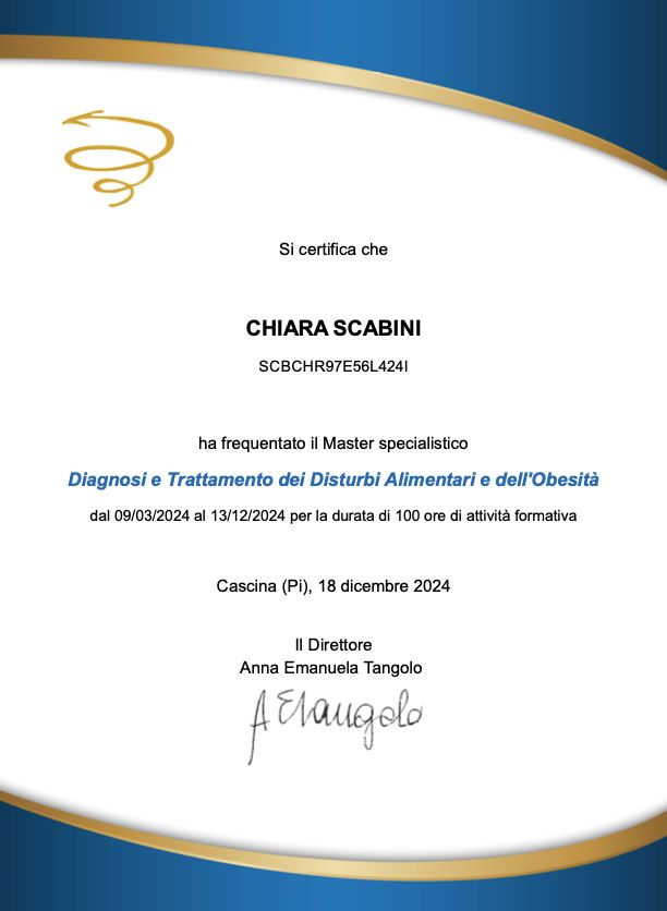 Ho conseguito la Laurea Triennale in Biotecnologie presso l’Università di Trieste nel 2020 e la Laurea Magistrale in Scienze dell'Alimentazione nel 2022. Inoltre, ho conseguito nel 2024 il Master in Diagnosi e trattamento dei disturbi alimentari e dell’obesità c/o Performat.