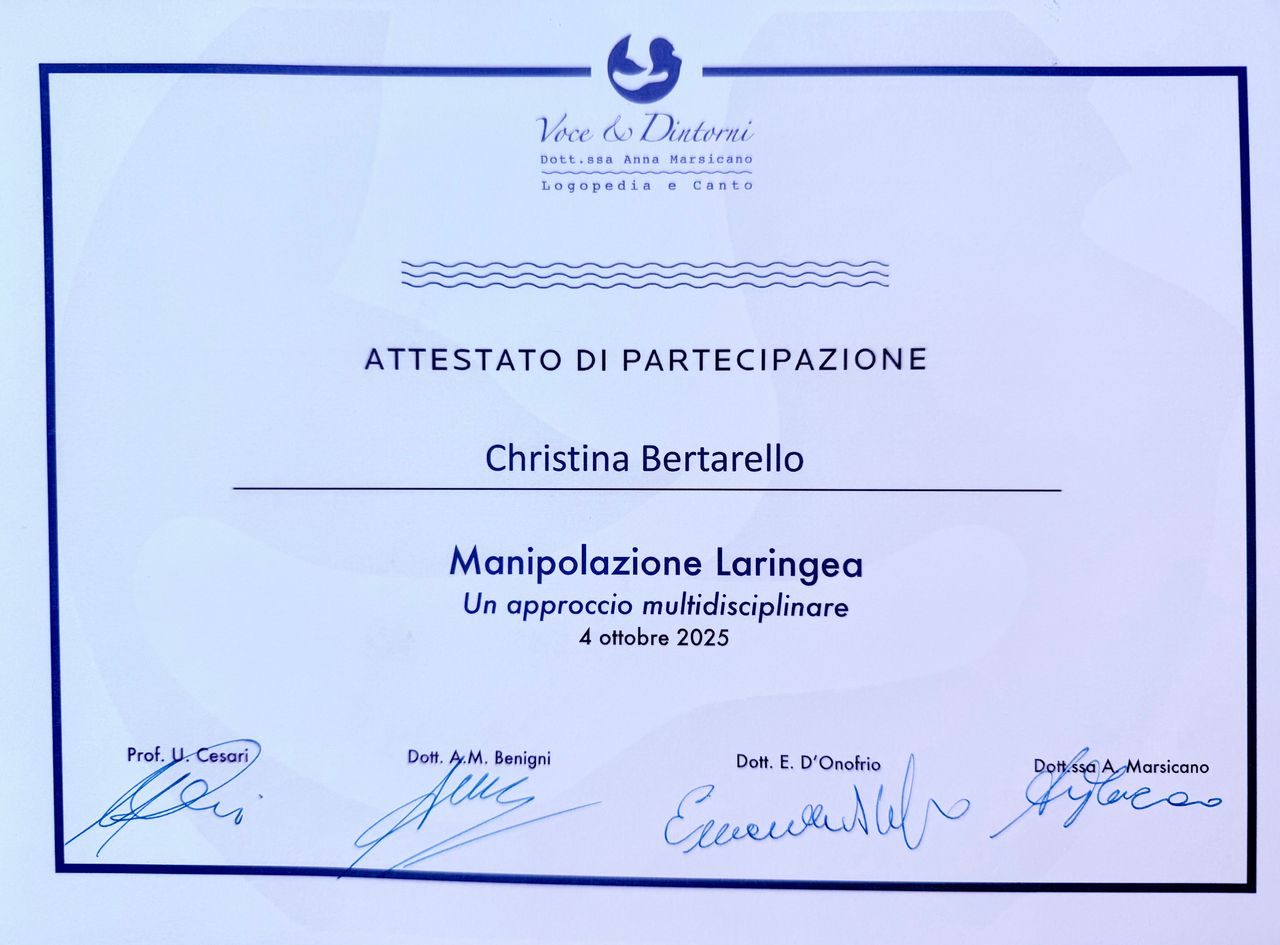 sono lieta di informarvi che nel 2023 ho frequentato il corso ufficiale Novafon dedicato al trattamento dei disturbi della voce parlata e cantata.