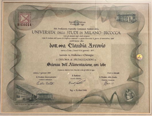 Nell’anno 2006 ho conseguito la Specializzazione in Scienza dell’Alimentazione ad indirizzo clinico presso l’ Università Bicocca di Milano con 70/70 lode, con una tesi in ambito di malnutrizione nel paziente oncologico in trattamento chemio e radioterapico.