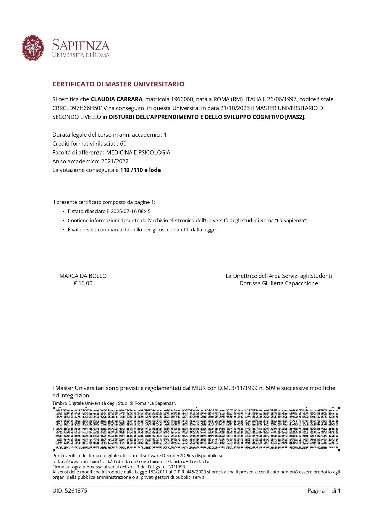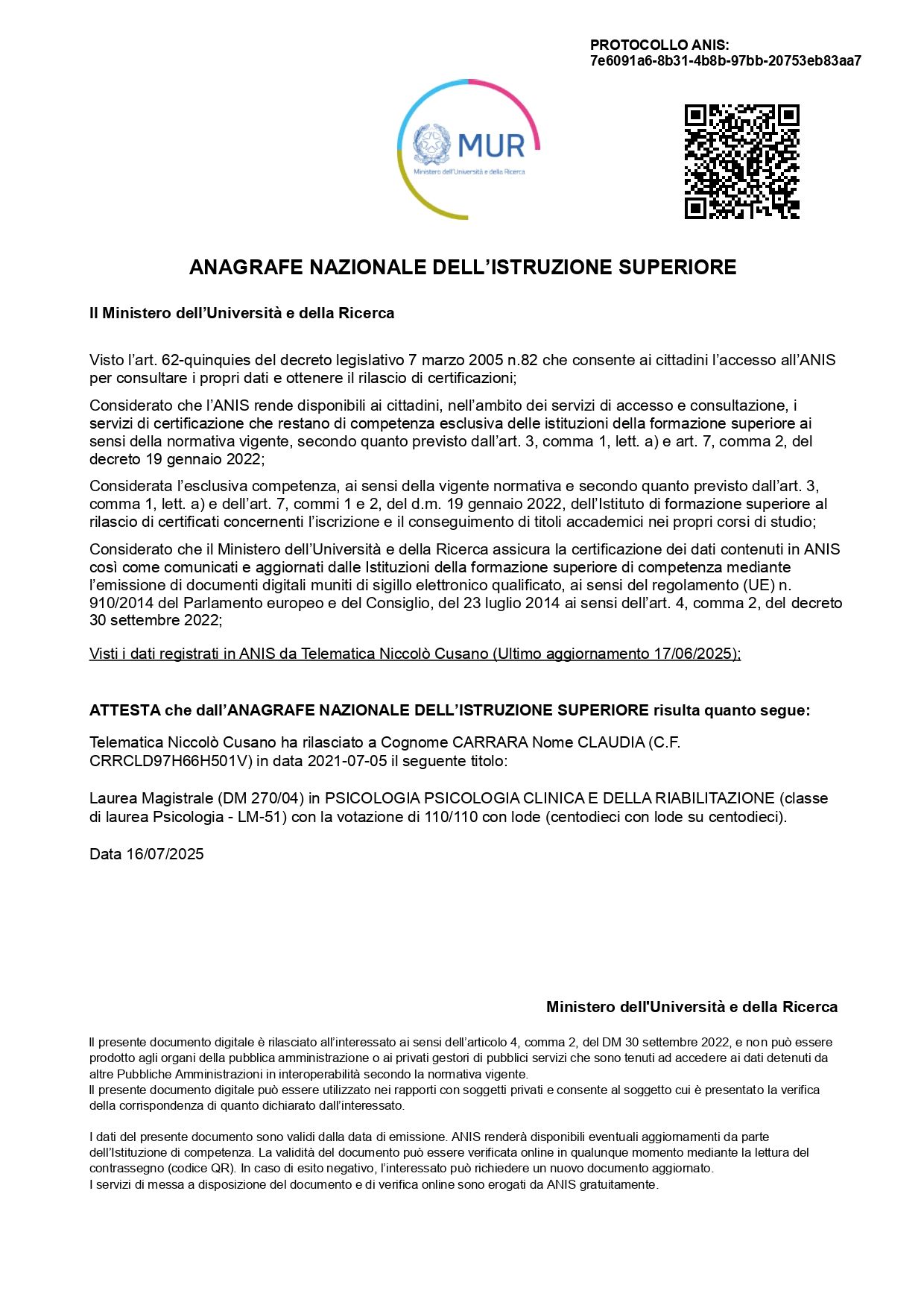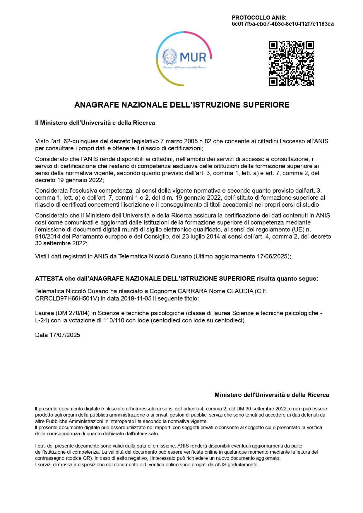 Sono la Dott.ssa Claudia Carrara, Psicologa iscritta all’Albo A, specializzata nei disturbi dell’apprendimento (DSA) e dello sviluppo cognitivo in età evolutiva. Lavoro con bambini, adolescenti e famiglie, offrendo percorsi di valutazione, supporto psicologico e potenziamento delle funzioni cognitive.