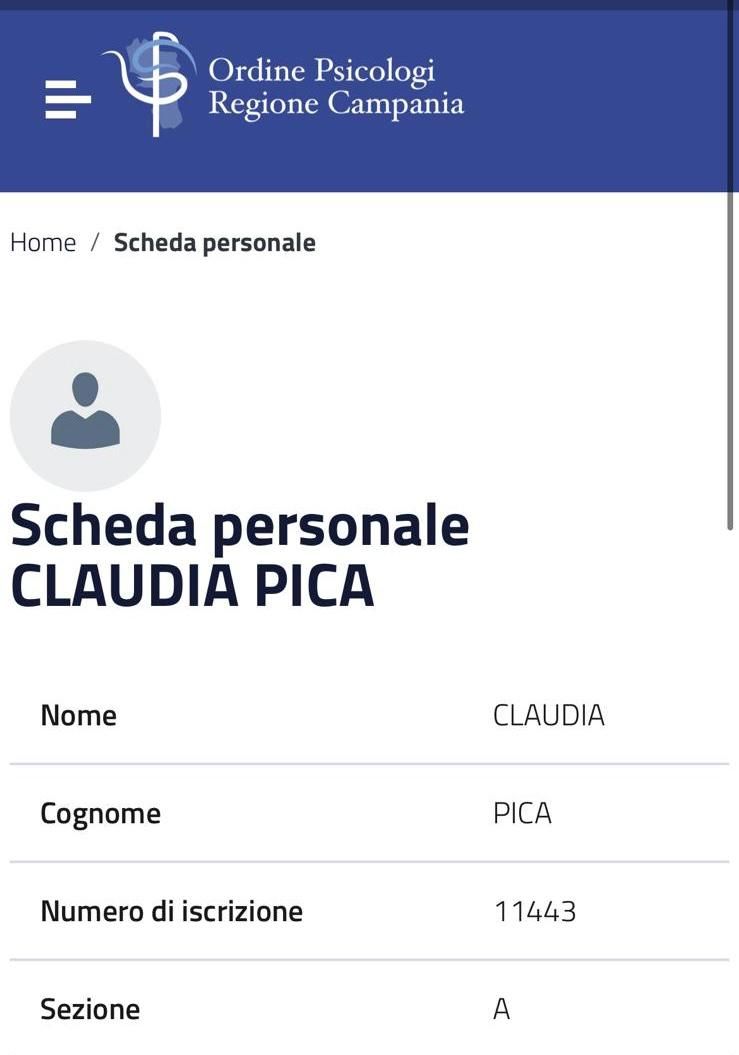 Sono iscritta all'Albo dell'Ordine degli Psicologi della Campania con n° 11443 -sez. A.