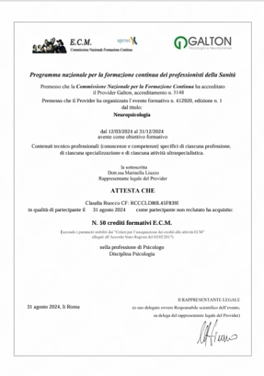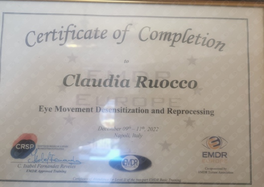 Sono Claudia Ruocco, Psicoterapeuta e Pratictioner EMDR, Esperta in Disturbi d'ansia e dell'umore, Psicologa Clinica e Neurodiagnostica (Esperienza biennale per U.S. Army). La vasta esperienza clinica maturata negli anni e l'approccio terapeutico (evidence based, supportato da ricerche scientifiche) mi danno la possibilità di risolvere in tempi brevi i diversi disturbi che affliggono la persona: > Ridurre lo stress e sintomi psicosomatici quali: insonnia, fibromialgia, cefalee, acufeni, vertigini, dolori gastrointestinali, cervicali, pensieri ripetitivi, agitazione, ossessioni e tic, dist. ormonali; > Emotivi: disturbi dell'umore (depressione), ansia, attacchi di panico, ossessioni (DOC), fobie, anoressia e bulimia, gestione della rabbia e impulsività, tristezza, perdita di senso della vita; > Cognitivi: scarsa concentrazione, distraibilità, scarsa memoria, difficoltà di ragionamento; > Relazionali: dipendenza affettiva, crisi di coppia, rapporto genitori/figli, separazioni; > Dipendenze: alcool, fumo, cibo, internet, dipendenze affettive; > Disturbi dell'infanzia e dell'adolescenza: tic e DOC, deficit dell’attenzione, iperattività, disturbi emotivi. Ma posso esserti di supporto anche se ti senti bloccato, in difficoltà, angosciato, triste, non apprezzato, impotente, non amato, in lutto... Ecco qualche parola su come lavoro: Io non impongo al paziente cosa fare. Piuttosto durante la terapia si cerca di indagare quali sono i meccanismi che bloccano la risoluzione di un disagio/problema/sintomo e accompagnare passo dopo passo la persona verso il Ben-Essere nel rispetto dei suoi bisogni. Il mio intento principale è quello di creare un’atmosfera di fiducia, comprensione e di ascolto. Ciò mi consente di accogliere le esigenze del paziente impostando un lavoro "in collaborazione" verso la risoluzione di un sintomo invalidante, il rafforzamento della propria auto-consapevolezza, il raggiungimento degli obiettivi individuati come risolvere il dolore psichico/fisico, affrontare i cambiamenti che la vita "impone", superare un antico trauma o la fine di una relazione, dare senso e direzione alla propria vita, aumentare la propria autostima. COSA TI OFFRO COME TERAPEUTA: - Lavoro su Traumi e "ferite" del passato; - Un modello terapeutico che mira alla trasformazione ed è orientato alla risoluzione dei problemi anziché basato sulla gestione di una psicopatologia; - Indicazioni concrete su cosa modificare per raggiungere il tuo benessere; - Lavoro in maniera attiva, esplicita ed esperienziale per correggere le esperienze emozionali disfunzionali e le credenze alla base dei comportamenti non funzionali, affinché tutto ciò che riguarda la tua identità psico-corporea sia in armonia; - Obiettivi chiari e tempi brevi per raggiungerli.