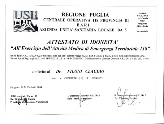24 febbraio 2004 - Idoneità all’Esercizio del Servizio Emergenza Urgenza del 118, conseguito presso la ex ASL BA/5.