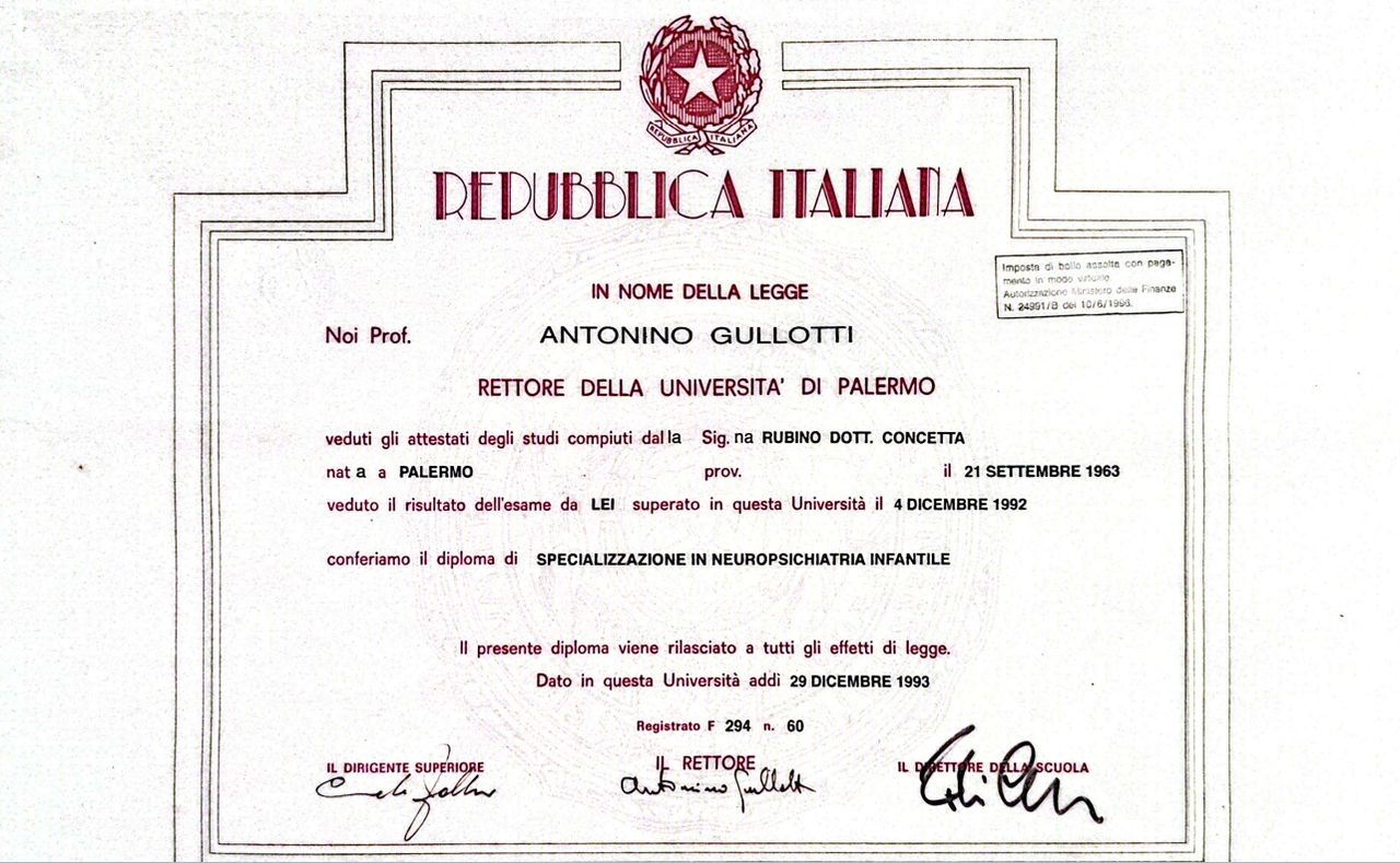 Sono laureata dal 1988, specializzata in Neuropsichiatria Infantile , ho sempre lavorato come Neurologo presso Ospedali della Città di Palermo , e negli ultimi 10 anni di carriera presso l' ASP di Palermo , al PTA Biondo ,presso un ambulatorio territoriale . Dal mese di Marzo 2025 , sono in pensione , ma mi dedico ai pazienti come ho sempre fatto .