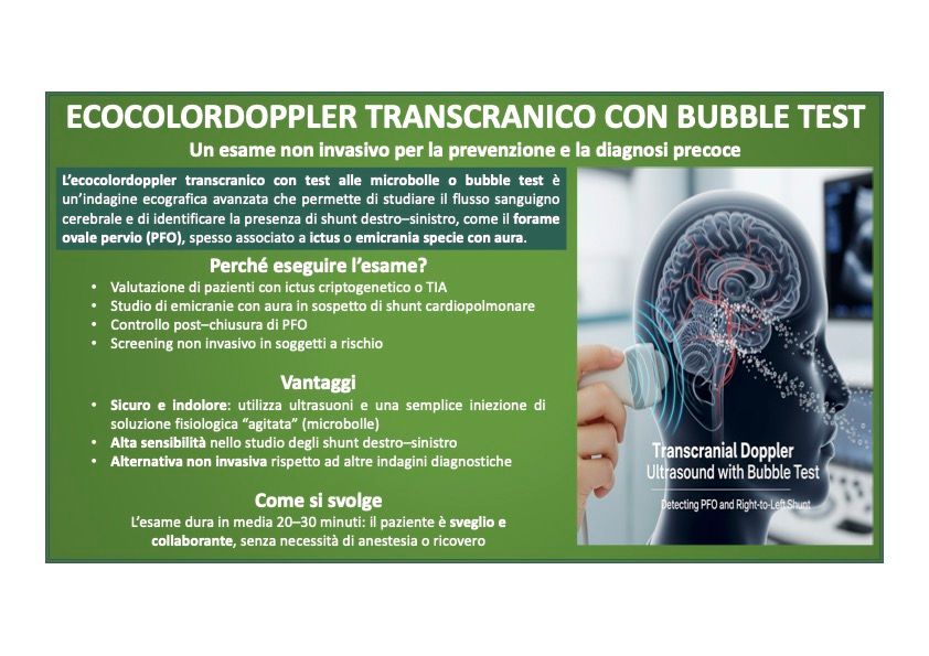 ECOCOLORDOPPLER TRANSCRANICO CON BUBBLE TEST (O TEST ALLE MICROBOLLE): esame sicuro, indolore, non invasivo e altamente sensibile per la ricerca del Forame Ovale Pervio (molto utile in pazienti con ictus o emicrania specie con aura).