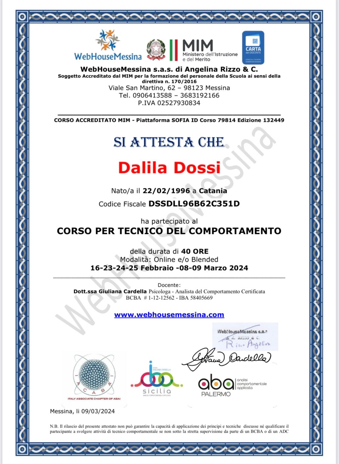 Oltre alla mia attività clinica, sono anche un Tecnico del Comportamento ed utilizzo la Terapia ABA (Applied Behavior Analysis) per progettare interventi individualizzati con l’obiettivo di potenziare abilità cognitive, linguistiche e comportamentali, in particolare nei bambini e nei ragazzi in età evolutiva. In questo ambito, ho maturato una solida esperienza nel lavoro con le famiglie, accompagnandole con strategie e strumenti pratici per affrontare le sfide quotidiane.