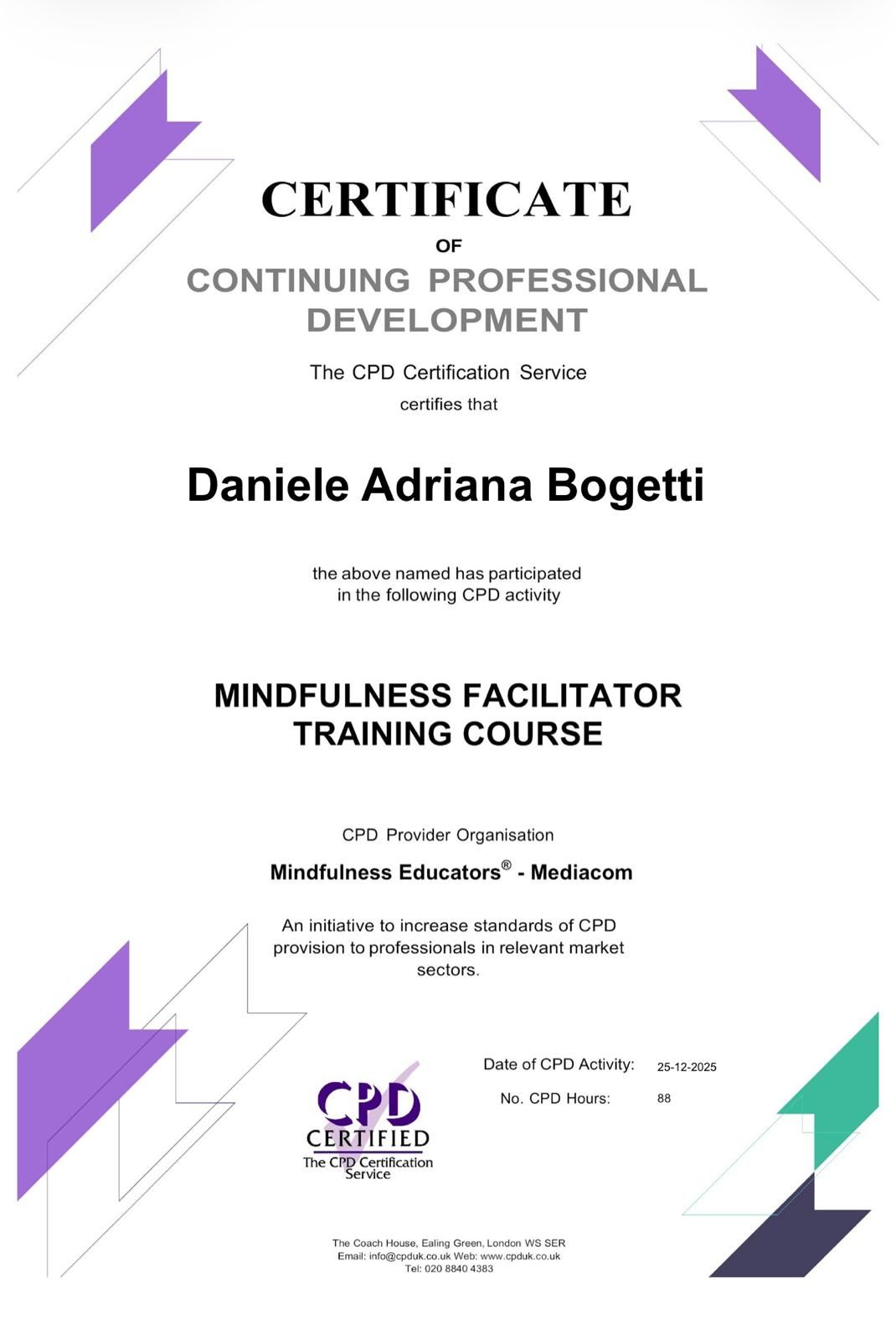 Sono formata nella pratica “mindfullness”, un percorso di consapevolezza emotiva utile in momenti particolari della nostra vita per ridurre lo stress emotivo e coltivare presenza, calma e resilienza