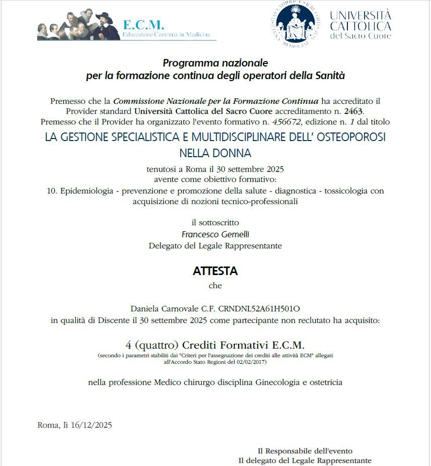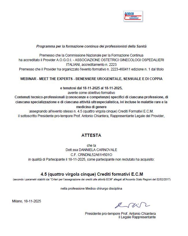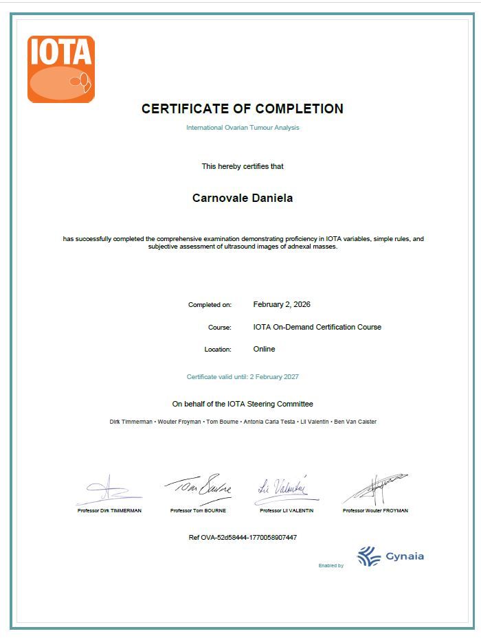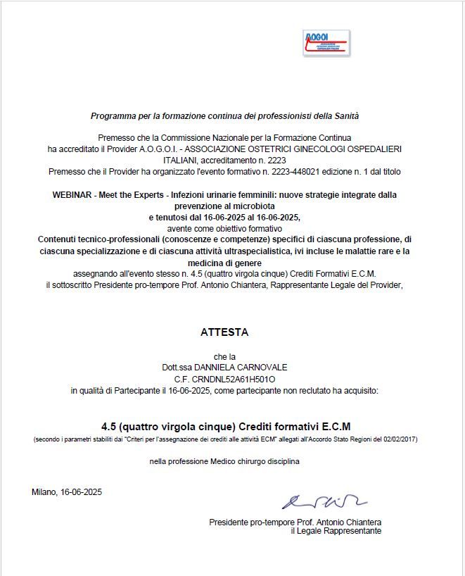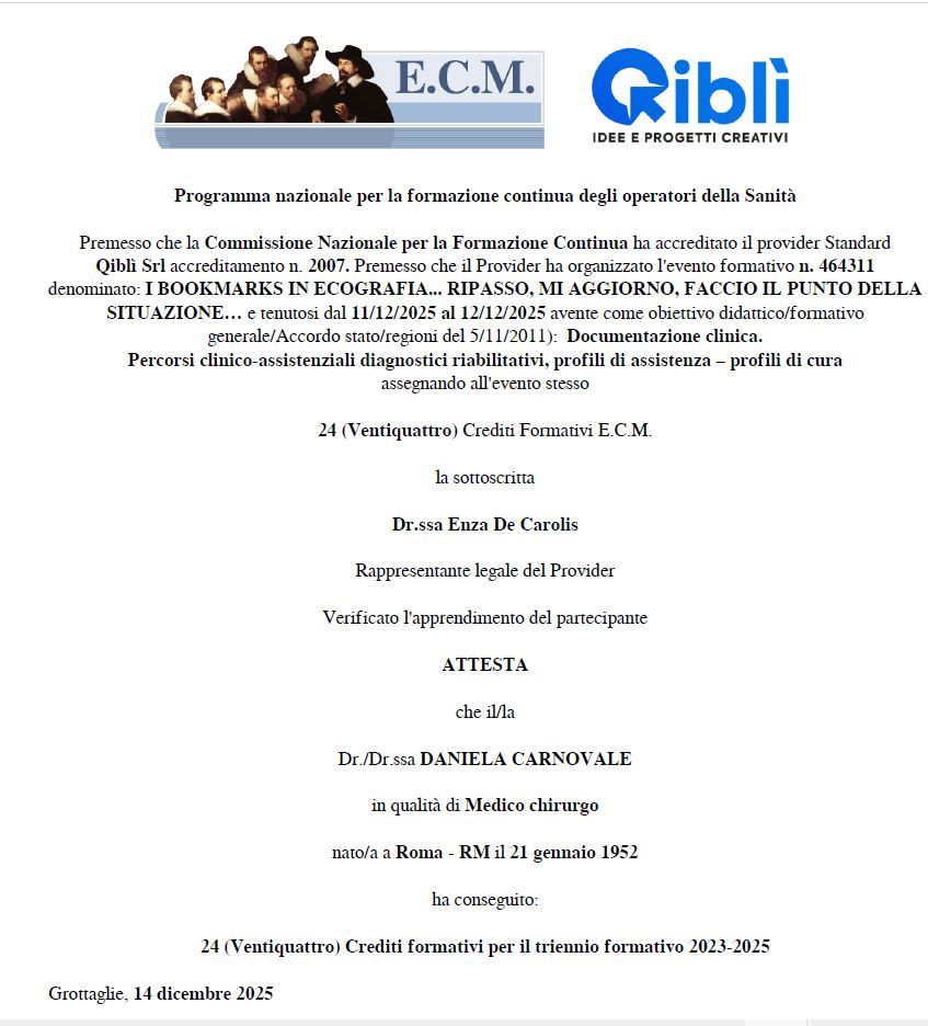 Sono la dottoressa Daniela Carnovale e per 40 anni ho seguito i miei pazienti sia nel campo della ginecologia sia nel campo della medicina generale, utilizzando dal 2000 l'ecografo per l setting del MMG ( es addome superiore e studio della tiroide) e della ginecologia mantenendomi in costante aggiornamento e formazione nel complesso mondo della disciplina medica.