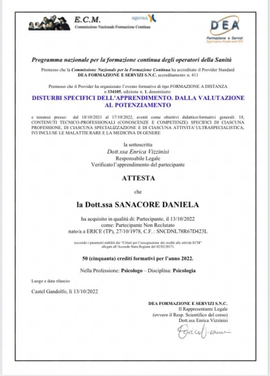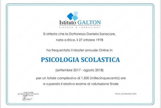Ho conseguito un primo Master in Psicologia Scolastica e, successivamente, un secondo in Diagnosi e trattamento dei disturbi specifici dell’apprendimento. Da diversi anni mi occupo di età evolutiva sia come referente unico degli sportelli d’ascolto scolastici sia in ambito privato.