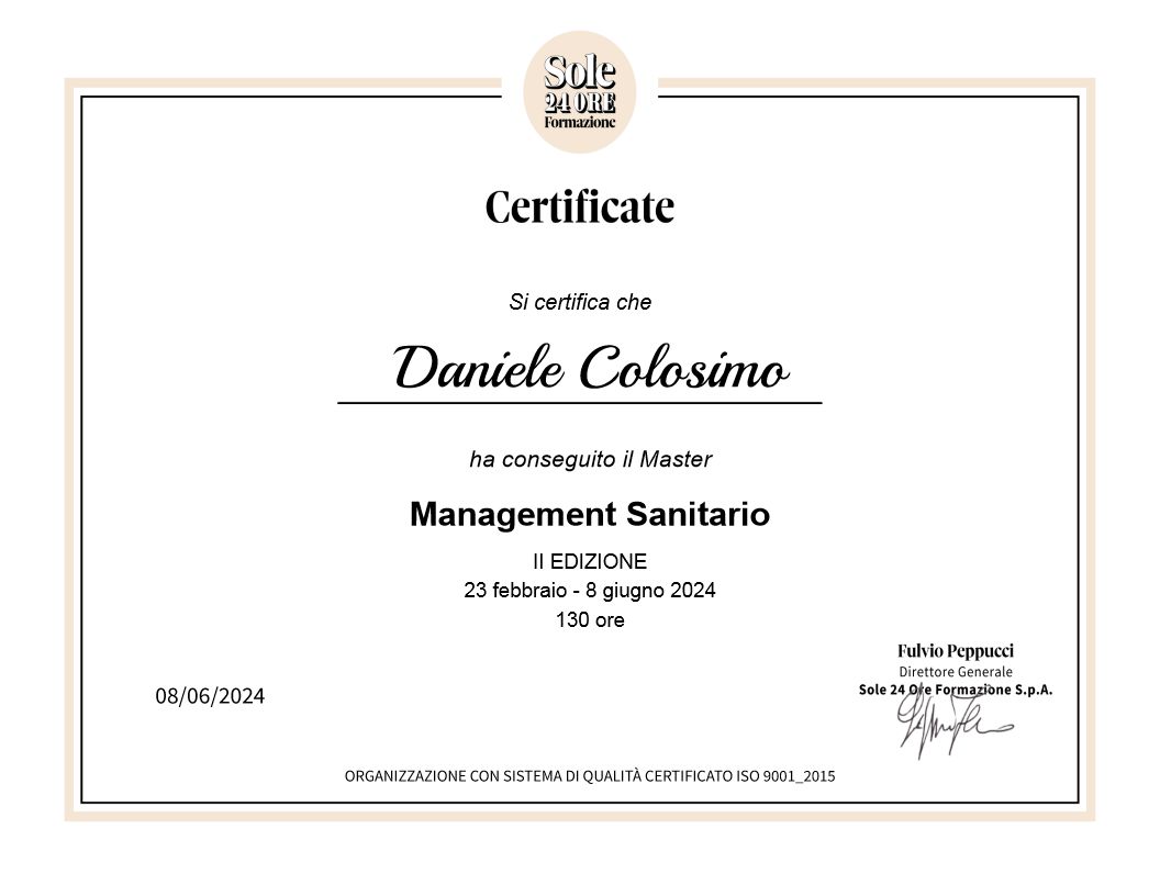 Mi sono laureato nel 2010 presso l'Università degli Studi di Roma "La Sapienza" nel 2010. Ho svolto tirocini in tutti i servizi medici, tra cui chirurgia, medicina interna, neurologia, psichiatria, neuropsichiatria infantile. Ho svolto sei mesi presso l'Università di Liegi come studente Erasmus nel 2008. Nel triennio 2011-2014 ho svolto il Corso di Formazione Specifica in Medicina Generale presso la Asl Roma B- Ospedale Sandro Pertini. Successivamente, ho cominciato il Corso di formazione specialistica in Patologia Clinica e Biochimica Clinica presso l'Università degli Studi di Roma di Tor Vergata, dove mi sono occupato di donazione di sangue intero e piastrine da aferesi, citofluorimetria per i trapianti di cellule staminali, aferesi terapeutica e produttiva, citofluorimetria per la diagnostica oncoematologica, autoimmunità, morfologia del sangue. Nel 2019 ho svolto l'attività di guardia medica, ambufest e vaccinazioni pediatriche. A fine anno mi sono trasferito all'estero, dove ho lavorato come medico di medicina generale. Ho ripreso tale attività in Italia in aprile 2022 presso il comune di Collevecchio (RI). In data 14/09/2024 mi sono abilitato alla prescrizione dei programmi biotecnologici Kyminasi diet.