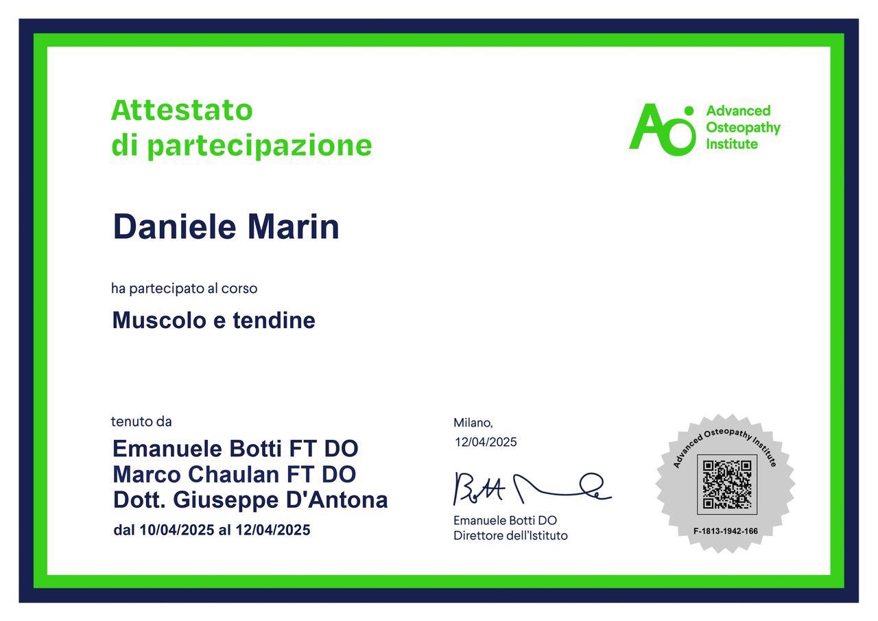 Mi chiamo Daniele Marin e sono un Osteopata laureato all’Istituto Superiore di Osteopatia (ISO) di Milano e presso la Buckinghamshire New University di Londra ho ottenuto il titolo di Master of Science in Osteopathy. La mia formazione non si ferma qui: terminati gli studi, ho conseguito il diploma di Istruttore di Ginnastica Posturale presso l’Istituto ATS (Advanced Training System) di Milano, ho conseguito il titolo post-graduate nel trattamento di bambini e donne in gravidanza e sto approfondendo autonomamente numerose tematiche tra cui il trattamento di pazienti sportivi e il trattamento delle cicatrici. Da sempre appassionato di sport, ho avviato diverse collaborazioni con società sportive, dedicandomi al trattamento e al supporto alla riabilitazione post-infortunio degli atleti. L'obiettivo che mi pongo con ogni paziente? Ricerco la causa del suo dolore. Come? Approccio il corpo nella sua globalità cercando di comprendere le interazioni che stanno alla base del dolore e, alleviandolo con trattamenti manuali, facilito i processi di autoguarigione del paziente. In questo modo non ci si limiterà alla risoluzione del sintomo, ma ci si spingerà più in profondità per evitare che il dolore si ripresenti e quindi prolungare il benessere della persona. Attualmente ricevo presso il mio studio privato a Cusano Milanino (MI), in Urban Fitness Porta Romana (Corso di Porta Romana 106, MI) e a domicilio (in provincia di Milano e Monza Brianza) con l'utilizzo di lettino professionale.