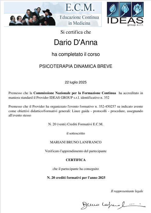Il dott. D’Anna ha seguito mio figlio di 12 anni per un paio di mesi circa ad inizio 2025 e i risultati si sono visti fin da subito. Con grande professionalità e correttezza ci ha consigliato di interrompere il percorso, ritenendo che nostro figlio non avesse più bisogno di supporto psicologico. Recentemente ci siamo rivolti di nuovo a lui per una consulenza, poiché nostro figlio ha iniziato a balbettare da qualche mese e volevamo capire se ci fosse una causa emotiva. Anche in questa occasione si è dimostrato disponibile, attento e molto chiaro nelle spiegazioni. Un professionista competente, onesto e umano, che consigliamo con fiducia.