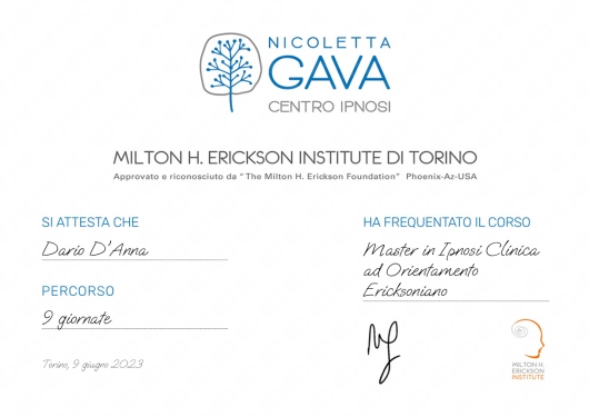 Prima dell'esame di abilitazione ero già terapista del comportamento (rbt) e, subito dopo l'abilitazione, ho continuato i miei studi e la pratica approfondendo il mondo della Mindfulness e della meditazione. Successivamente ho frequentato il Master in Ipnosi Clinica ad Orientamento Ericksoniano presso il M. Herickson Institute di Torino (N. Gava), sperimentando su me stesso e con i miei pazienti le grandi potenzialità insite in ognuno di noi.