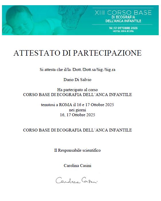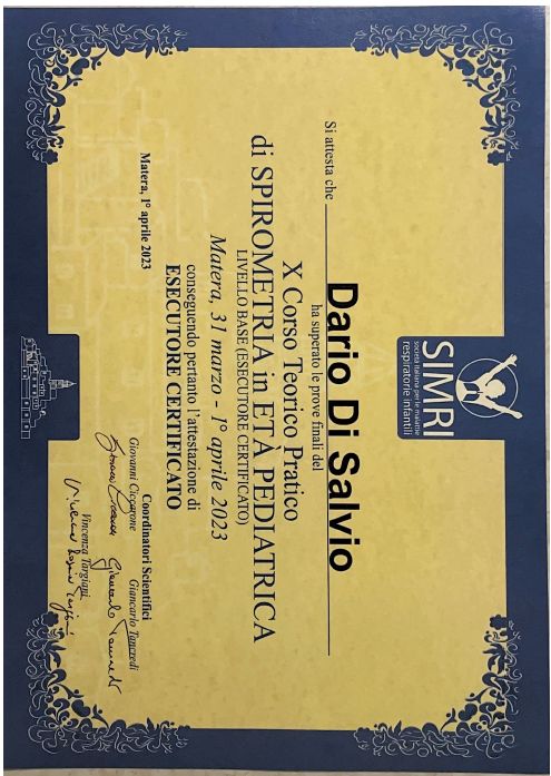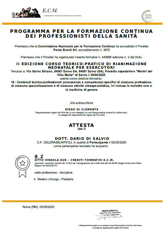 nel Marzo 2022 Diploma di Rianimatore Pediatrico PALS (Pediatric Advanced Life Support- American Heart Association), nel Giugno 2022 Corso Pratico e Teorico di Rianimazione Neonatale (Linee Guida 2020-2025- Società Italiana di Neonatologia), nel Settembre 2022 Corso di Perfezionamento in Ecografia Clinica Pediatrica (Società Italiana di Pediatria), nell’Aprile 2023 Diploma di Esecutore Certificato di Spirometria in Età Pediatrica (Società Italiana delle Malattie Respiratorie Italiana) e nel Novembre 2023 Corso pratico- teorico inerente la “Gestione e stabilizzazione della urgenza/emergenza neonatale alla nascita in attesa dello STEN” (A.O.R.N. “Sant’Anna e San Sebastiano” Caserta – Società Italiana di Neonatologia).