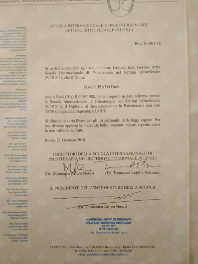 Il Dott. Dario Maggipinto è Psicologo, Arteterapeuta e Psicoterapeuta ad approccio psicodinamico, iscritto all'Ordine degli Psicologi della regione Abruzzo n. 2403.