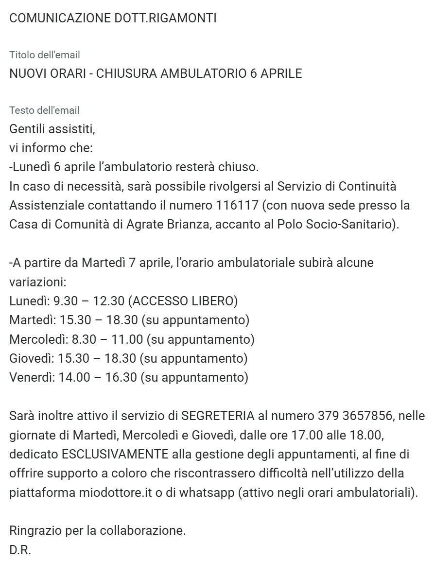 In alternativa — e preferibilmente — è possibile contattarmi telefonicamente negli orari ambulatoriali, così da potervi inserire personalmente nell’agenda settimanale.