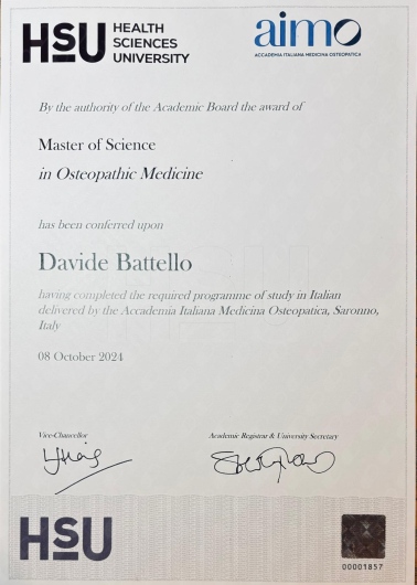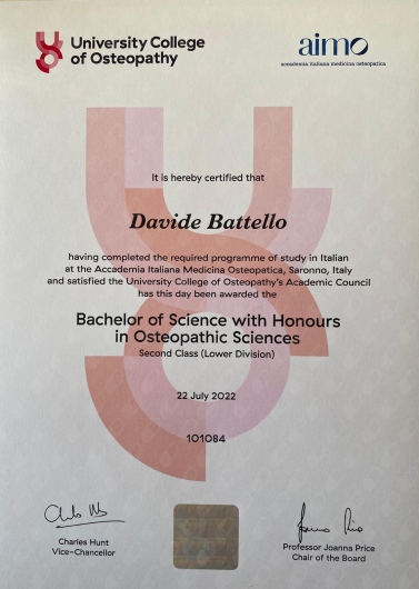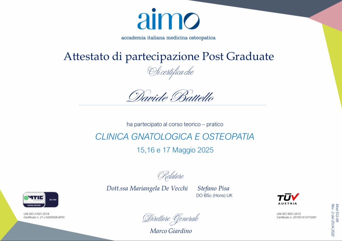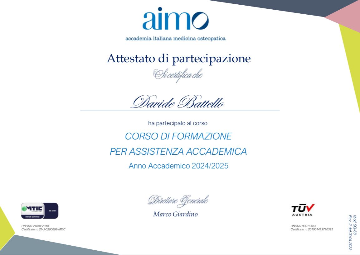 Osteopata formato presso AIMO (Accademia Italiana Medicina Osteopatica) con percorso di 5 anni, dove attualmente collaboro nell'ambito della formazione universitaria come assistente alla docenza.
