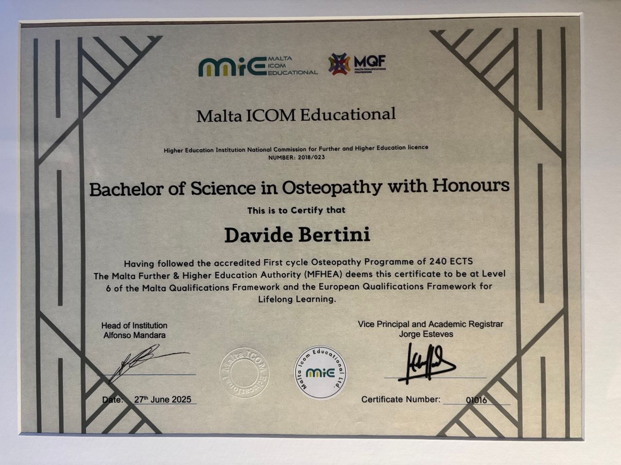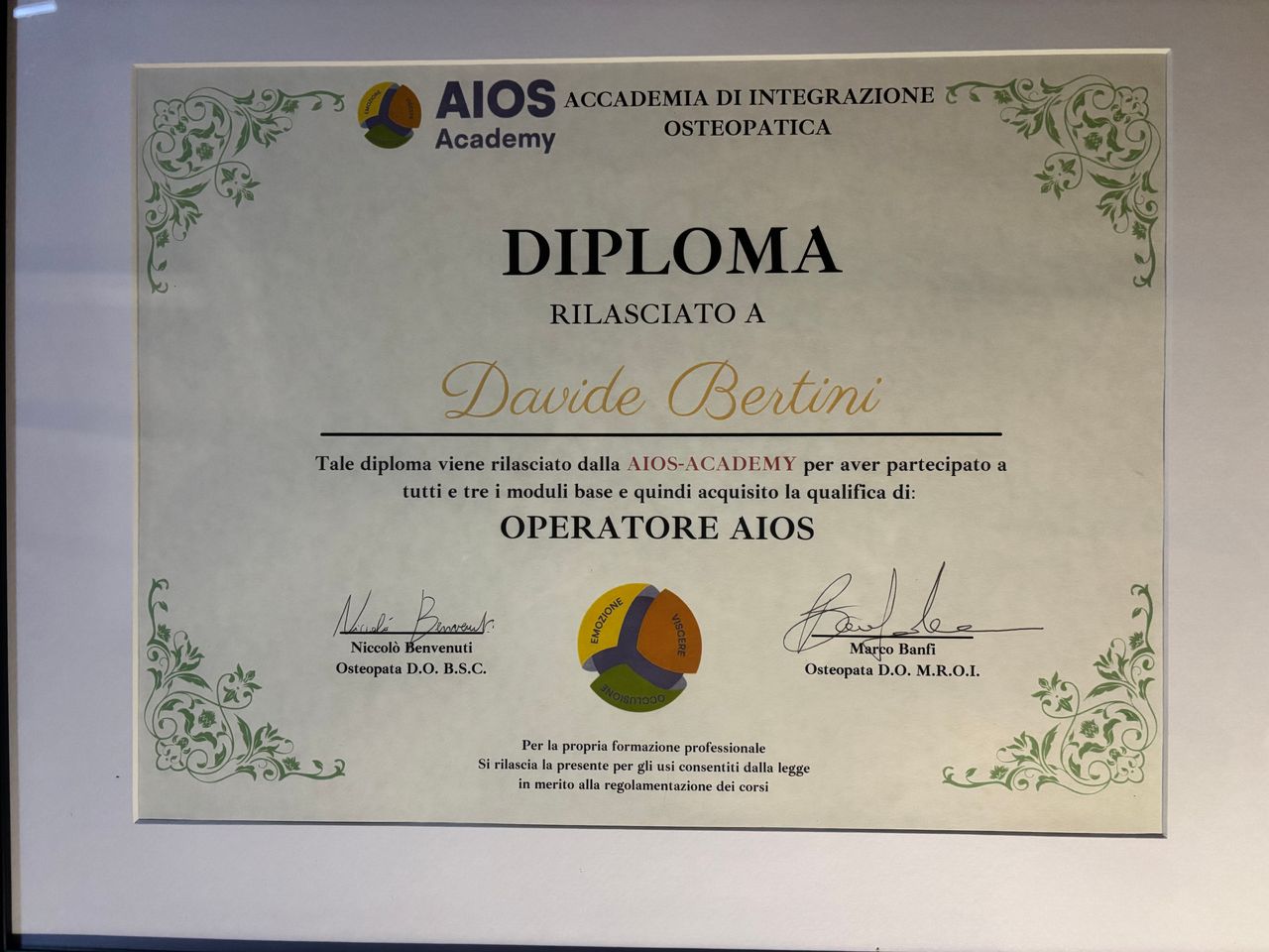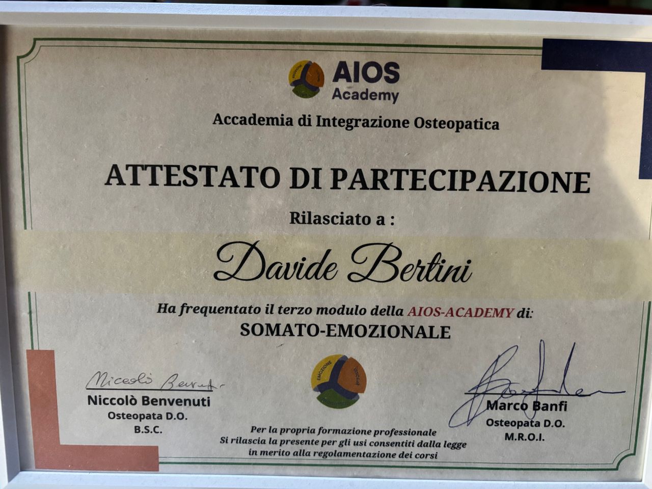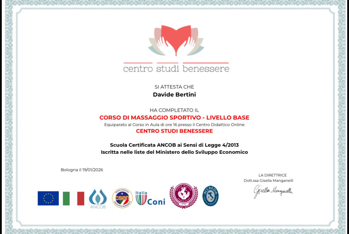 Mi chiamo Davide Bertini e sono un Osteopata, laureato nel giugno 2025 presso il MIE – Malta ICOM (International College of Osteopathic Medicine), sede di Firenze, dove ho conseguito il titolo BSc (Hons) Ost.