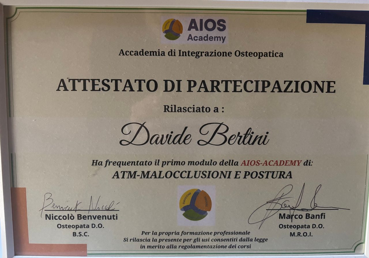 Nel corso della mia formazione ho inoltre ampliato le mie conoscenze attraverso percorsi di aggiornamento presso AIOS Accademia, approfondendo l’approccio somato-emozionale, il trattamento delle malocclusioni e l’osteopatia viscerale.