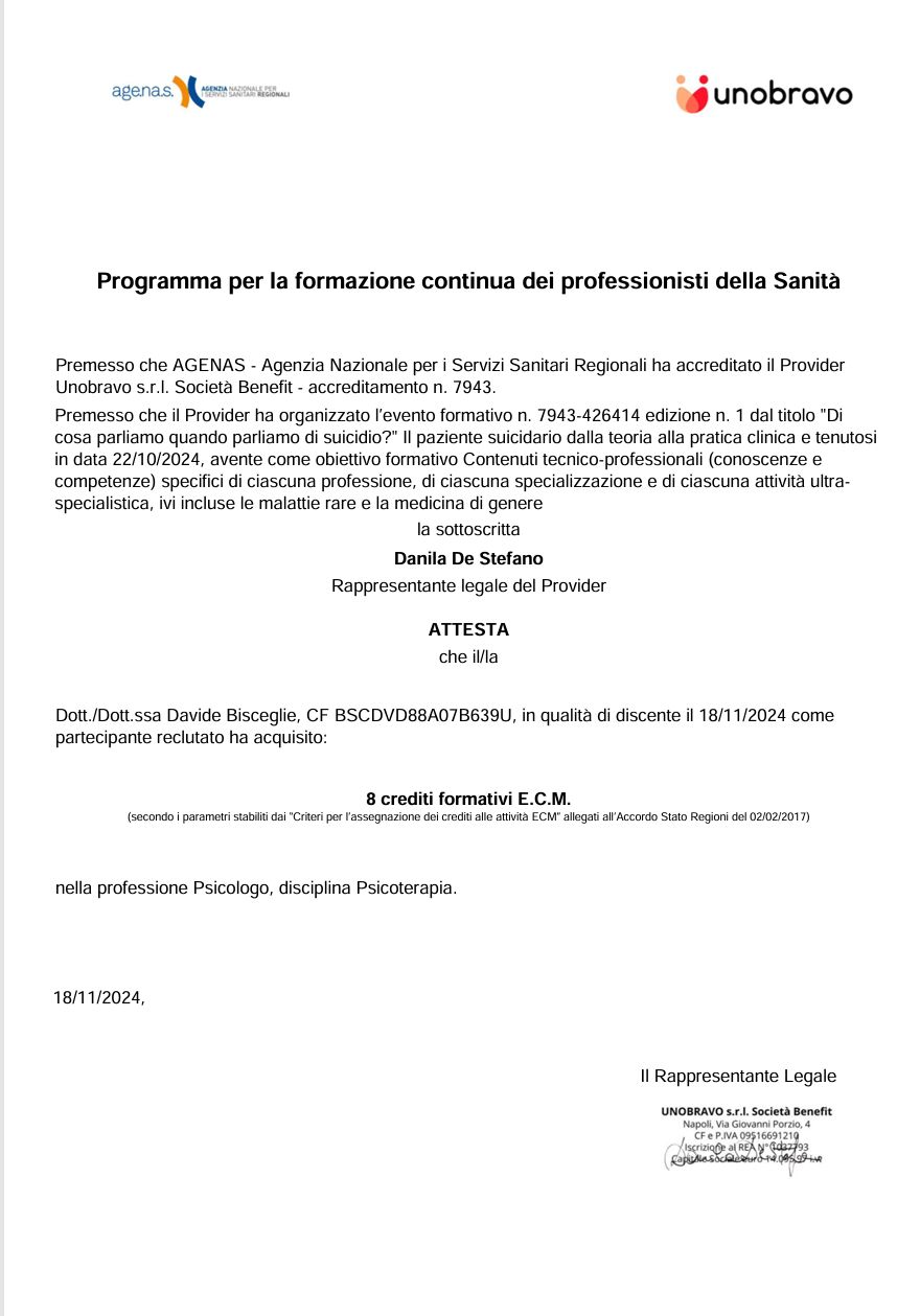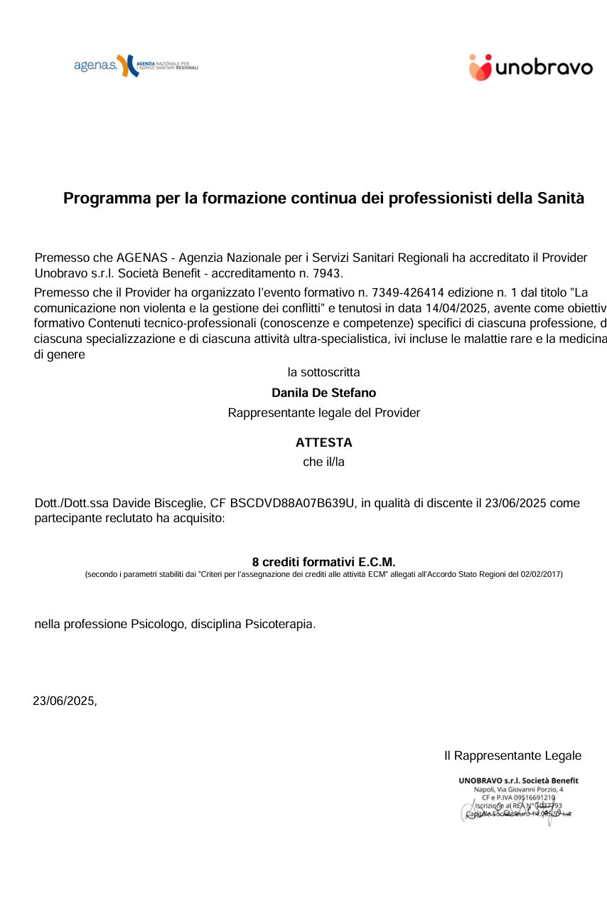 Sono un professionista della salute mentale, specializzato in psicoterapia personale, di coppia e familiare. Accompagno le persone ad accrescere la propria consapevolezza su come funzioniamo, in un clima accogliente di ascolto empatico e competente. Si tratta di un percorso delicato e profondo, attraverso il quale è possibile prendersi cura delle ferite passate e presenti, favorendo la costruzione di risorse per affrontare in modo funzionale i progetti presenti e futuri.