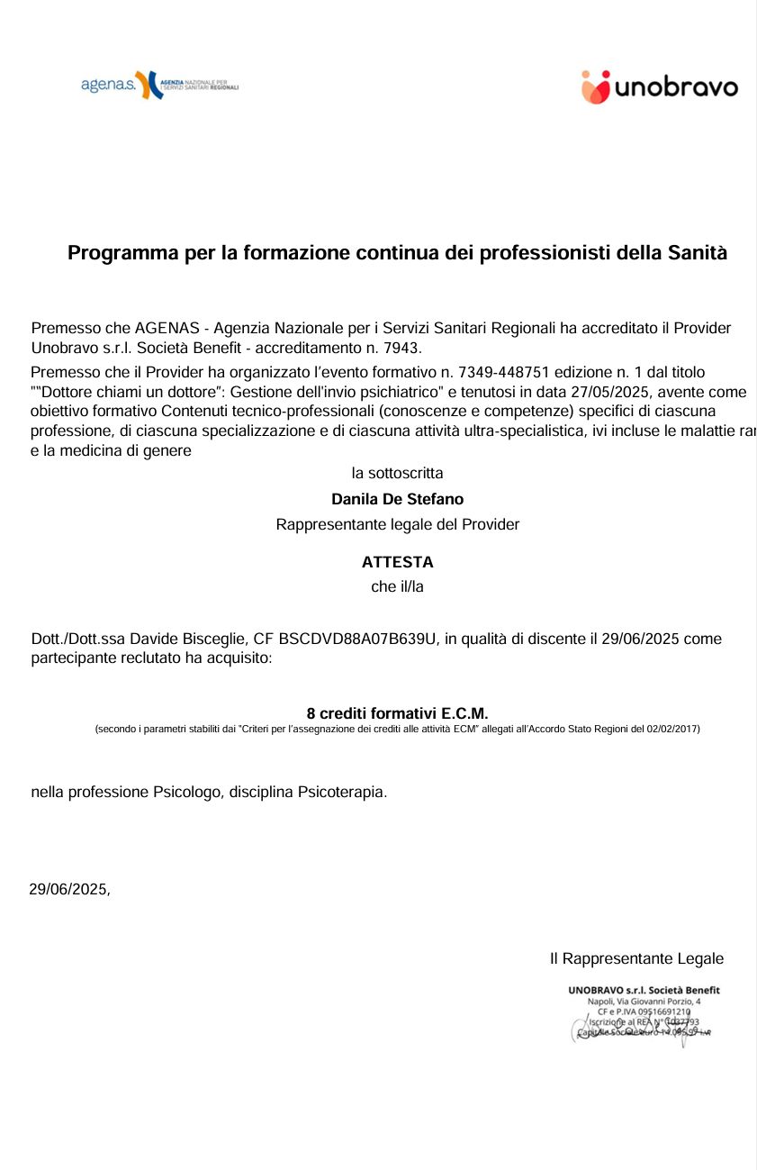 Hai avuto una visita con Dr. Davide Bisceglie? Condividi quello che pensi. Grazie alla tua esperienza gli altri pazienti potranno scegliere il miglior dottore per loro.