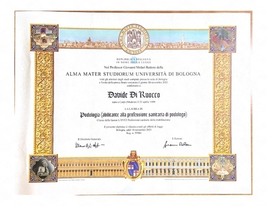 Ho conseguito nel 2024 l'upgrade della Laurea spagnola quadriennale, ottenendo il titolo di Podoiatra con competenze cliniche e chirurgiche.