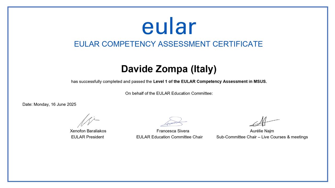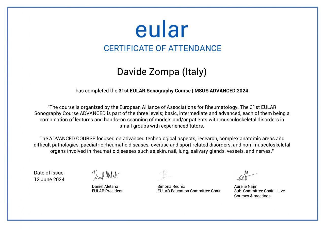 Ha sviluppato una particolare competenza nell’utilizzo dell’ecografia muscoloscheletrica e nelle infiltrazioni articolari ecoguidate, conseguendo la certificazione europea di livello avanzato rilasciata dall’EULAR (European Alliance of Associations for Rheumatology).