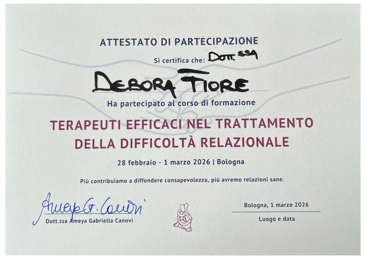 Sono la Dott.ssa Debora Fiore, Psicologa Clinica e Mediatrice Familiare. Aiuto adulti, adolescenti, giovani adulti e coppie che stanno attraversando un momento difficile e desiderano ritrovare equilibrio emotivo, chiarezza e relazioni più sane.