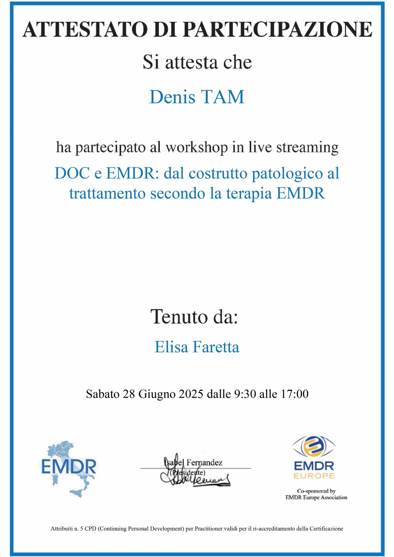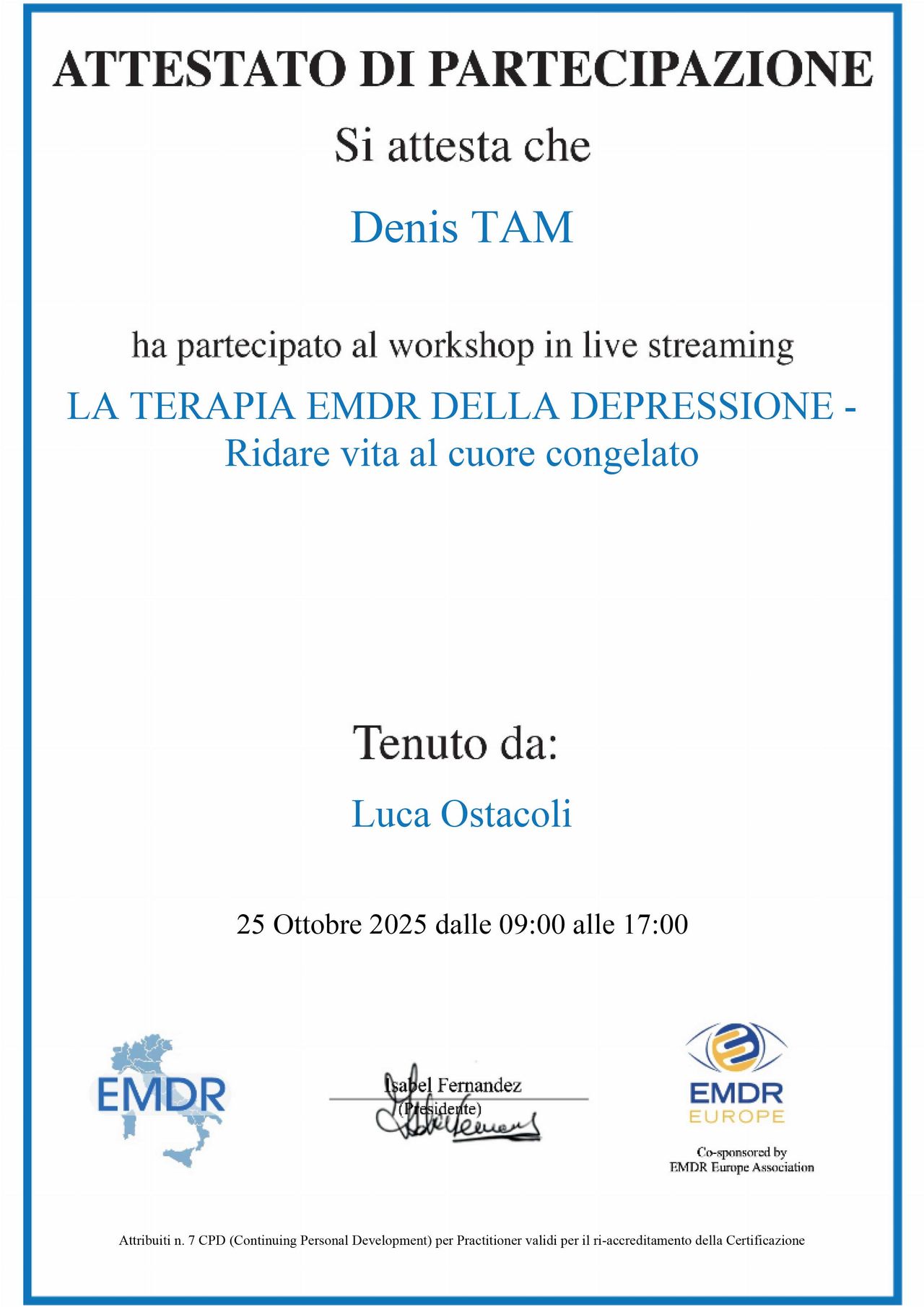 Concludere il percorso con il dott. Tam è stata un’esperienza trasformativa. Sin dal primo incontro, la sua professionalità ed empatia hanno creato uno spazio sicuro in cui esplorare vissuti complessi senza timore di giudizio. Grazie all’approccio integrato, che includeva l’EMDR, ho elaborato traumi radicati che credevo insuperabili: le sedute mi hanno permesso di sciogliere nodi emotivi che condizionavano relazioni e autostima, regalandomi una libertà inaspettata. Il dott. Tam non è solo preparato, ma sa adattare le tecniche alle esigenze personali, accompagnando ogni passo con sensibilità. Oggi ho strumenti concreti per gestire l’ansia, vedo le sfide con maggiore lucidità e ho ritrovato fiducia nelle mie risorse. Consiglio vivamente a chiunque voglia intraprendere un viaggio di crescita di affidarsi a lui: l’EMDR, unito al suo sostegno costante, ha fatto la differenza. Lascio questo percorso con gratitudine e la certezza di aver investito in me stesso. Grazie, dott. Tam!