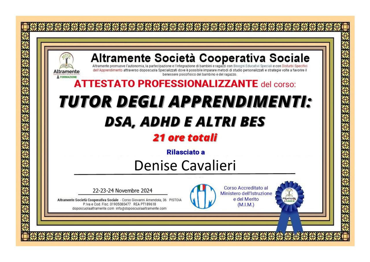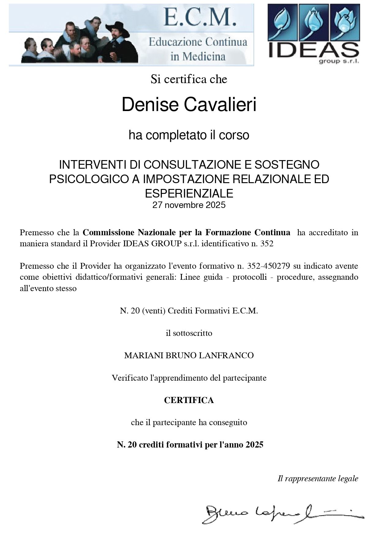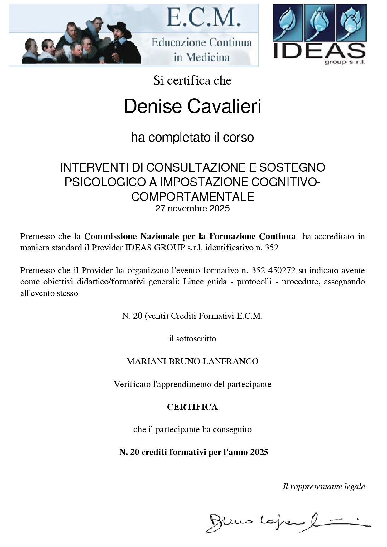 Mi chiamo Denise Cavalieri e sono una psicologa clinica iscritta all'albo.