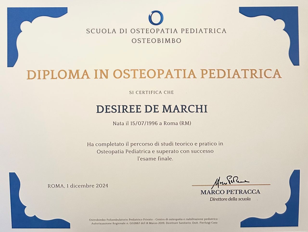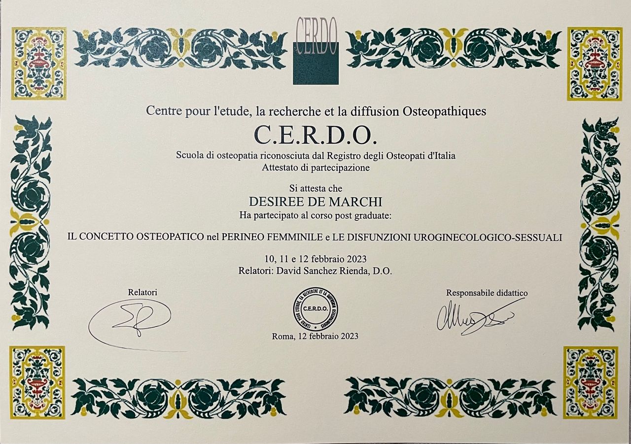 Sono Desiree De Marchi, osteopata D.O. diplomata presso la Scuola di Osteopatia C.E.R.D.O. Di Roma (Centre pour l’Étude, la Recherche et la Diffusion Ostéopathiques).
