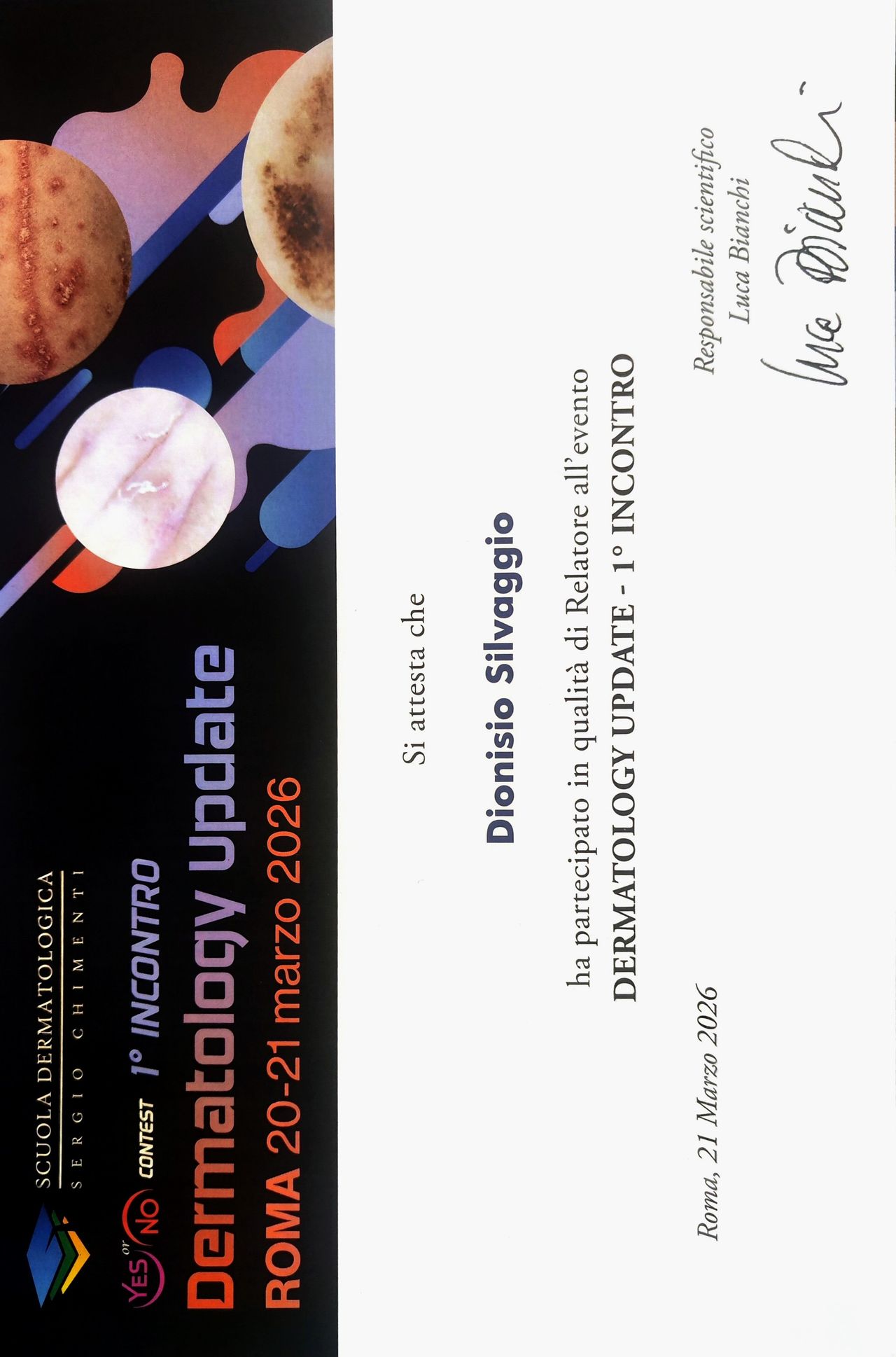 Il Dott. Dionisio Silvaggio si è laureato in Medicina e Chirurgia con lode presso l'università di Roma La Sapienza e specializzato con lode in Dermatologia e Venereologia, presso l’università di Roma Tor Vergata. I suoi campi di interesse sono: dermatologia oncologica (epiluminescenza), dermochirurgia, laserterapia, malattie sessualmente trasmesse, tricologia, acne, psoriasi e dermatite atopica (prurito). Nel corso degli anni ha avuto modo di frequentare diverse cliniche dermatologica di rilevanza nazionale ed internazionale, quali la clinica dermatologica della Seconda Università di Napoli (prof. Argenziano) e la clinica dermatologica dell'università medica di Graz (Austria - Prof. Cerroni). Vincitore di assegno di ricerca presso l'Università di Roma Tor Vergata. Autore di numerose pubblicazioni su riviste mediche internazionali indicizzate e relatore a congressi di rilevanza nazionale. Attualmente lavora come specialista in Dermatologia e Venereologia presso il Policlinico Tor Vergata, occupandosi, tra gli altri servizi, di diagnostica non invasiva (dermoscopia/epiluminescenza e microscopia confocale) e chirurgia dermatologica.