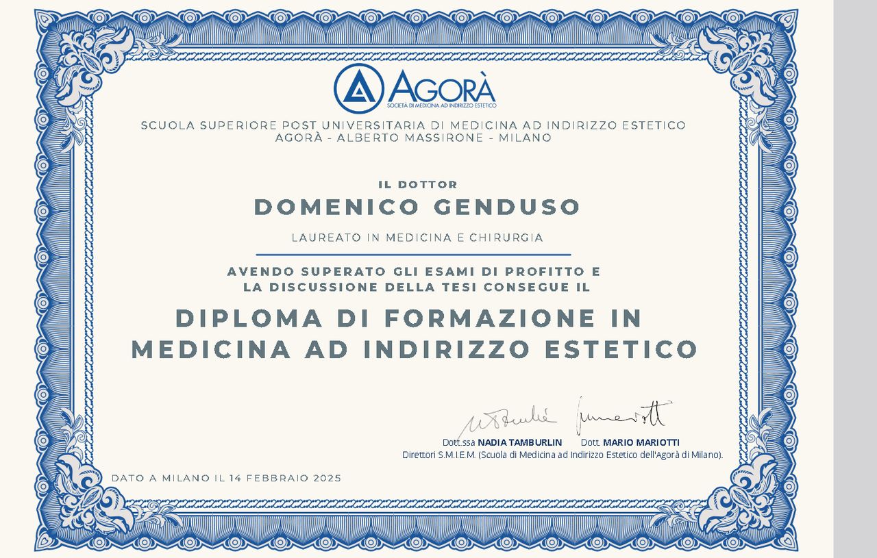 Sono un medico diplomato in Medicina Estetica presso la scuola di alta formazione Agorà di Milano, specialista in Ortognatodonzia, credo che ogni individuo meriti un trattamento personalizzato per affrontare le proprie preoccupazioni estetiche e raggiungere i propri obiettivi di bellezza. Ecco perché ti offro programmi terapeutici personalizzati progettati su misura per te, che abbracciano l'intero mondo della medicina estetica.I programmi personalizzati rappresentano un'esperienza unica e su misura. Con una consulenza individuale approfondita si capiranno le tue esigenze, discutendo dei tuoi desideri e creando un piano di trattamento personalizzato che si adatti perfettamente alle tue caratteristiche individuali e ai tuoi obiettivi. Inoltre, a seconda del tipo di programma scelto, potrai aspettarti un aspetto di ringiovanimento che va dai 3 ai 10 anni, per una trasformazione che vi farà sentire e apparire al meglio.