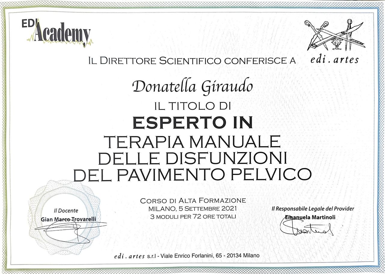 Donatella Giraudo è una fisioterapista italiana specializzata nella riabilitazione del pavimento pelvico, con sede a Milano. È considerata una delle figure di riferimento in Italia per il trattamento delle disfunzioni pelvi-perineali, sia in ambito clinico che formativo.