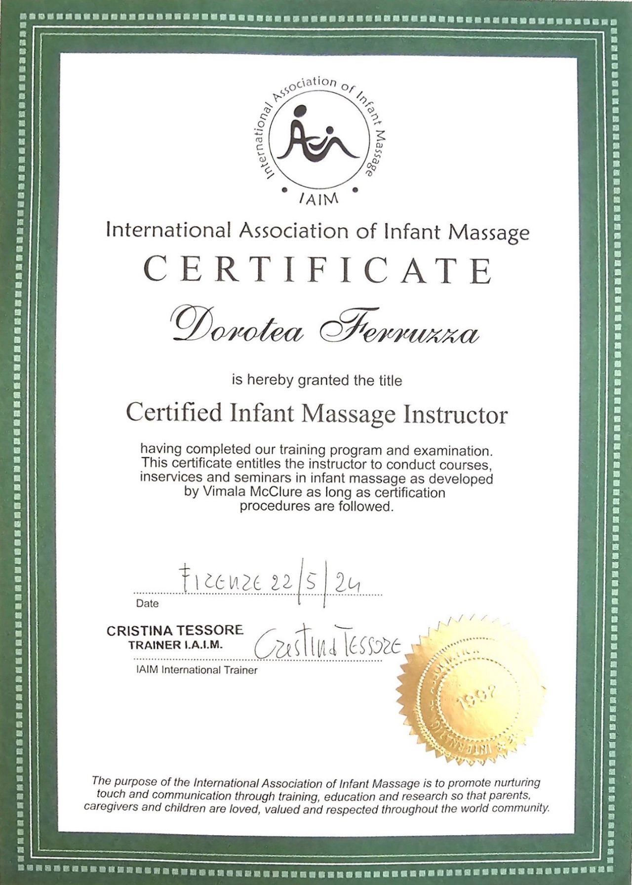 Ho conseguito il Master in Infermieristica in Area Pediatrica nel 2018 e dal 2024, sono Insegnante di Massaggio Infantile AIMI, con certificazione internazionale IAIM. Tra gli obiettivi del Massaggio Infantile c’è il supporto alla genitorialità, il contatto amorevole e la promozione del bonding nella costruzione del legame tra genitori e figli.