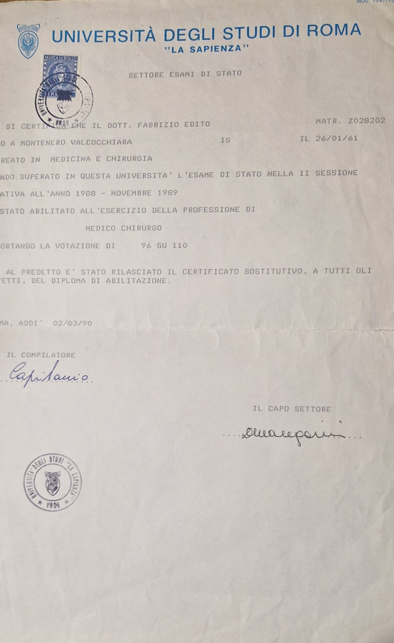 Il dottor Edito Fabrizio è un medico come se ne trovano pochi. Affabile empatico ed estremamente competente, molto attento ad instaurare con il paziente un rapporto umano. Trasmette grande serenità che unita alla sua competenza sono un’arma vincente. Lo conosco da molti anni, ma non si smentisce mai.