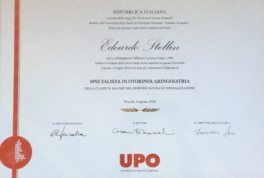2011-2016: Medico in formazione specialistica presso Clinica Otorinolaringoiatrica (Direttore: prof. Francesco Pia) - A.O.U. "Maggiore della Carità" di Novara.