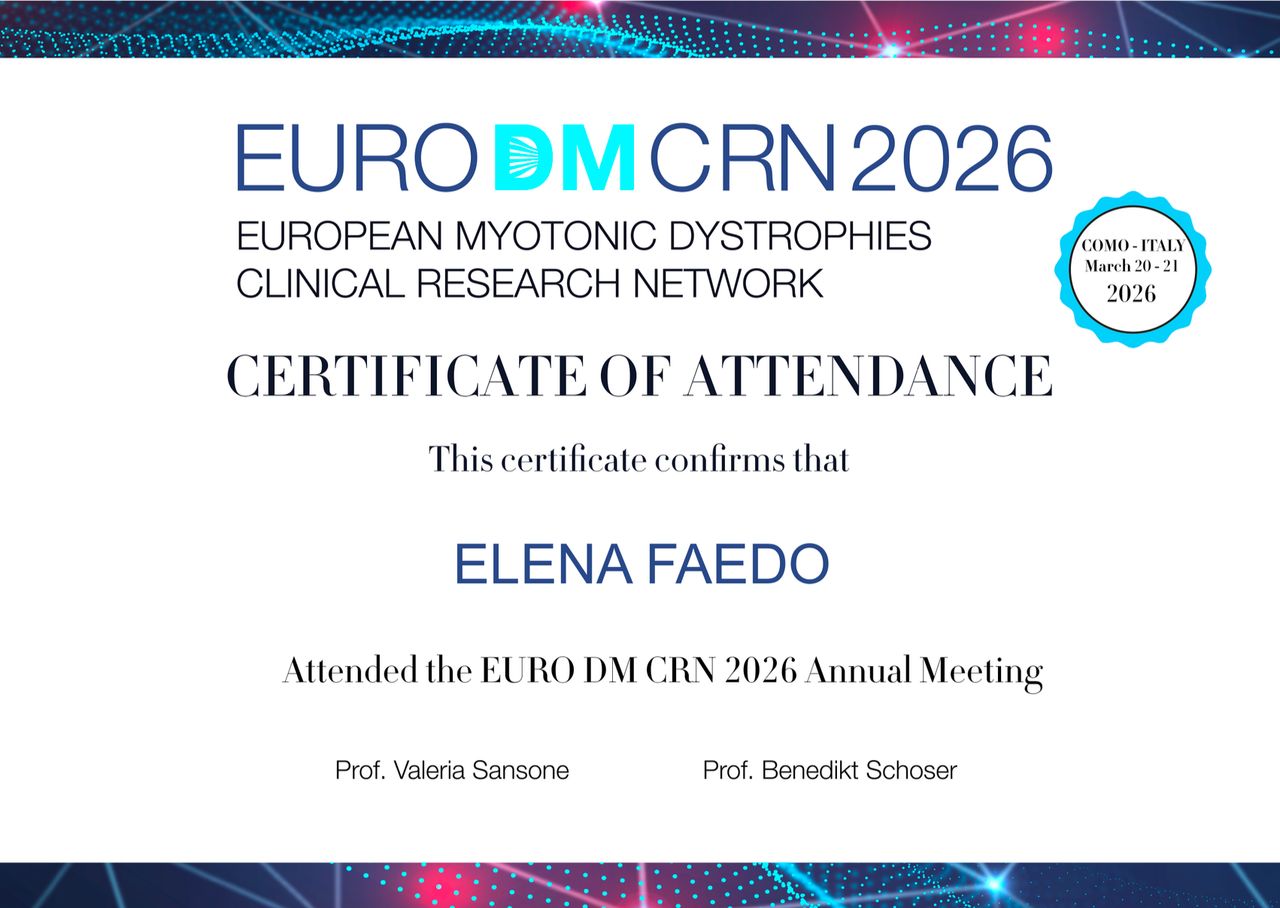 Ho svolto un periodo di formazione presso il Centro di Riferimento per le Malattie Neuromuscolari dell’Hôpital Henri-Mondor a Créteil, in Francia, e attualmente sto frequentando il Diplôme Inter-Universitaire (DIU) di Miologia presso l’Institut de Myologie di Parigi, con l’obiettivo di approfondire ulteriormente la mia conoscenza delle malattie neuromuscolari.