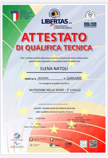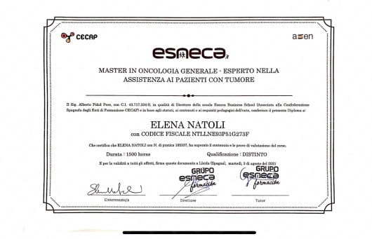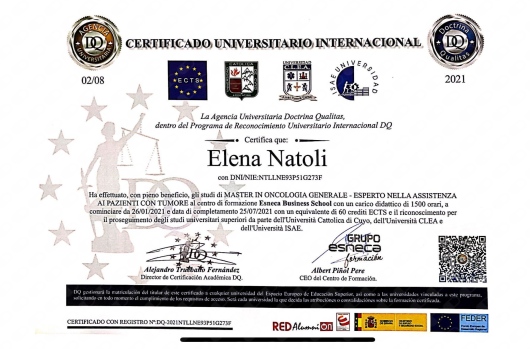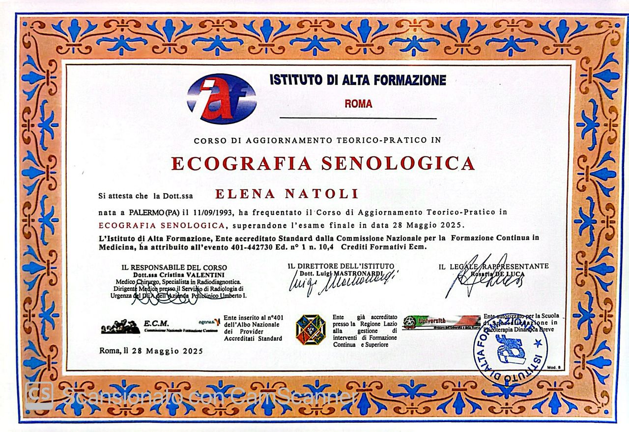Accanto all’attività oncologica, la Dottoressa Natoli opera anche nell’ambito della Nutrizione Clinica (in particolare oncologica) e della Nutrizione Sportiva. Ha conseguito Master di secondo e terzo livello in Nutrizione Clinica, Oncologica e Sportiva presso Esneca Business School e Accademia Italiana Fitness, ottenendo la certificazione di Tecnico CONI. Integra inoltre competenze diagnostiche con il Master in Ecografia presso SIUMB e un’ulteriore formazione presso la Scuola Italiana di Senologia.