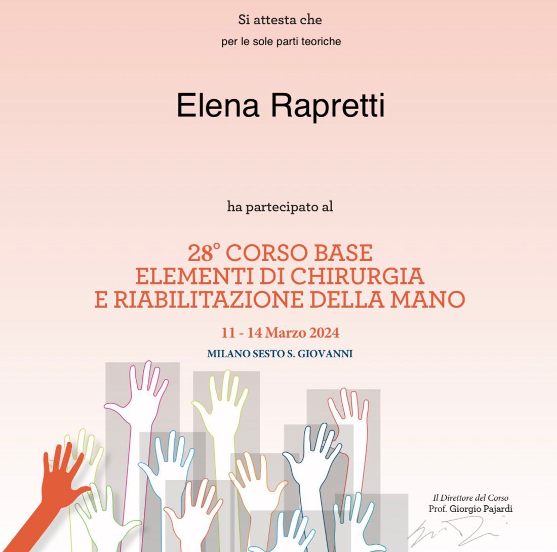 Nel corso degli studi ho partecipato al 28° corso base di chirurgia e riabilitazione della mano presso IRCCS Multimedica. Proseguo costantemente la mia formazione post-laurea e attualmente frequento il Master in Riabilitazione dei Disturbi Muscoloscheletrici presso l’Università di Genova, con l’obiettivo di offrire ai miei pazienti trattamenti sempre aggiornati ed efficaci.
