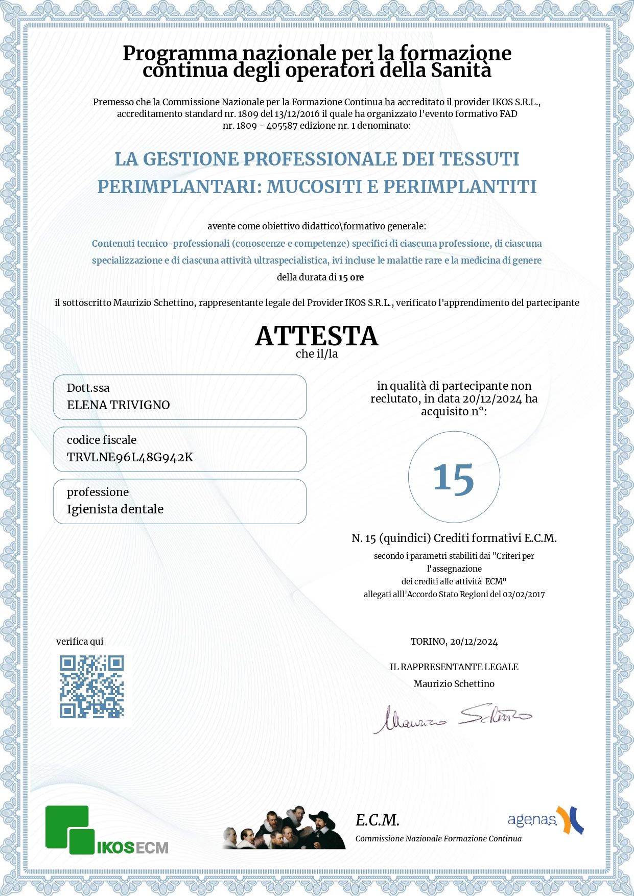 Ho conseguito nel 2021 il Master in “Igienista dentale esperto nella terapia delle malattie parodontali” presso l’Università degli Studi di Torino con votazione di 110/110 e lode.