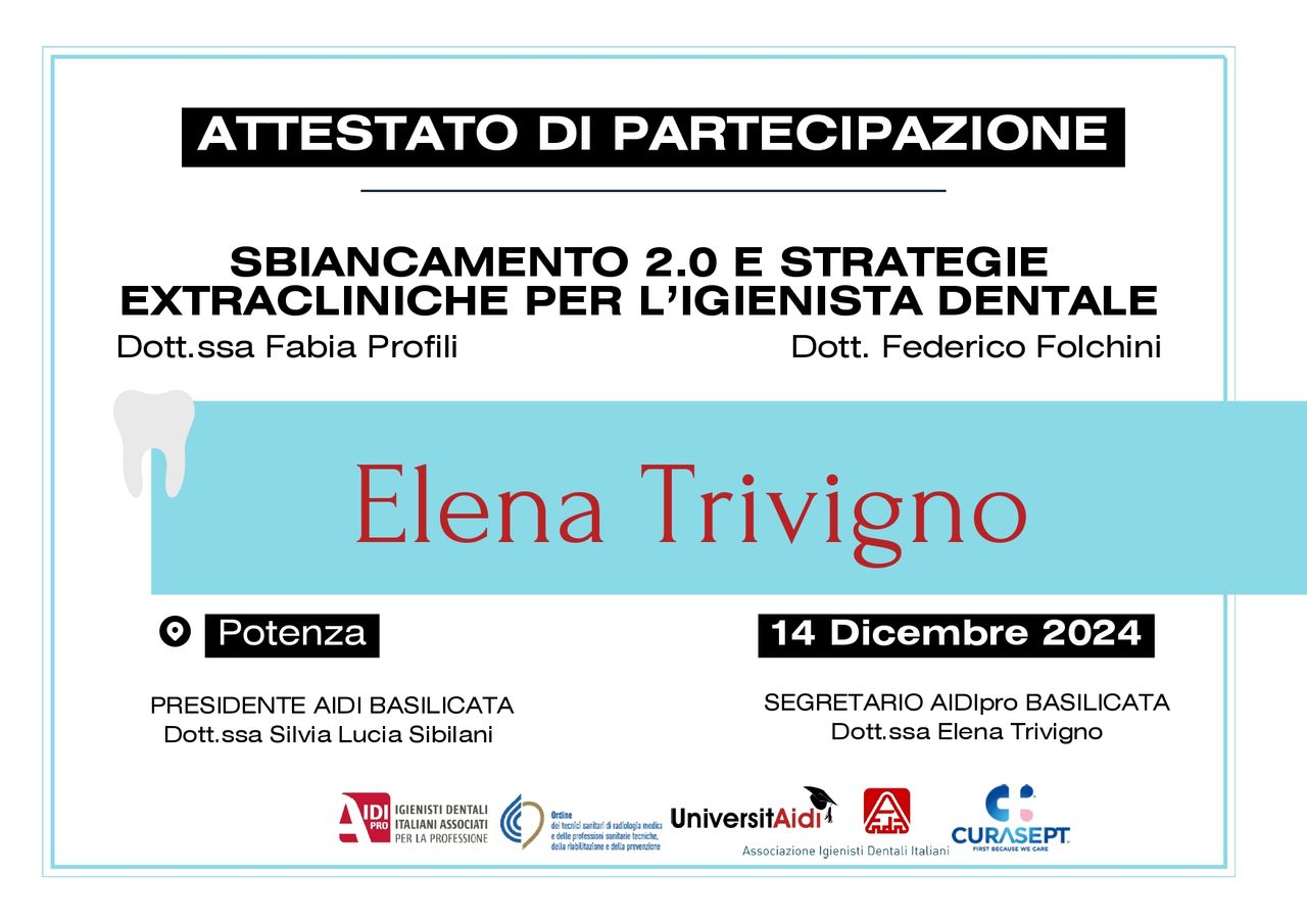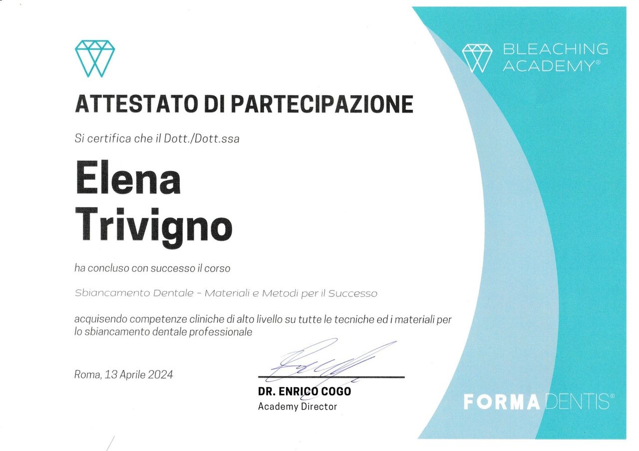 Nel 2024 ho concluso con successo il corso: “Sbiancamento dentale materiale e metodi per il successo” acquisendo competenze cliniche di alto livello su tutte le tecniche ed i materiali per lo sbiancamento dentale professionale.