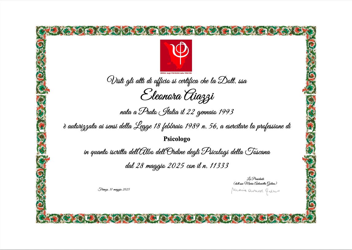 Sono la Dott.ssa Eleonora Aiazzi, psicologa e futura specializzanda in Psicoterapia Sistemico Relazionale. Mi occupo principalmente di emozioni: riconoscerle significa imparare a fare di ciascuna di essa (anche la più "scomoda") una risorsa e non un ostacolo. Offro consulenza e supporto psicologico per insegnanti, studenti e genitori, così da rendere l'esperienza scolastica un percorso sereno e più affine ai bisogni emotivi ed educativi di ciascuno. Esperta nell'ambito di Bisogni educativi speciali, Disturbi specifici dell'apprendimento, ansia scolastica, comprensione e gestione di dinamiche relazionali ed affettive in contesto scolastico e familiare, per l'intero ciclo della vita.