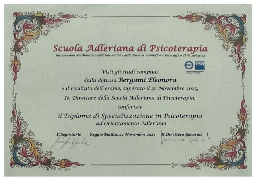 Il genuino interesse nei confronti dell'Altro mi ha spinta a dedicarmi a questa professione e a continuare a formarmi dopo la laurea in Psicologia Clinica, conseguendo la specializzazione in Psicoterapia Adleriana per l'adulto e l'età evolutiva. Le mie esperienze spaziano dall'area della salute mentale adulti a servizi di neuropsichiatria per infanzia e adolescenza, affiancando il lavoro nelle scuole di vari ordini e gradi alla libera professione. Oltre agli adulti, aiuto anche bambini e adolescenti a superare difficoltà emotive e sociali, così che possano affrontare con sicurezza e autonomia le molte sfide che la crescita riserva loro.