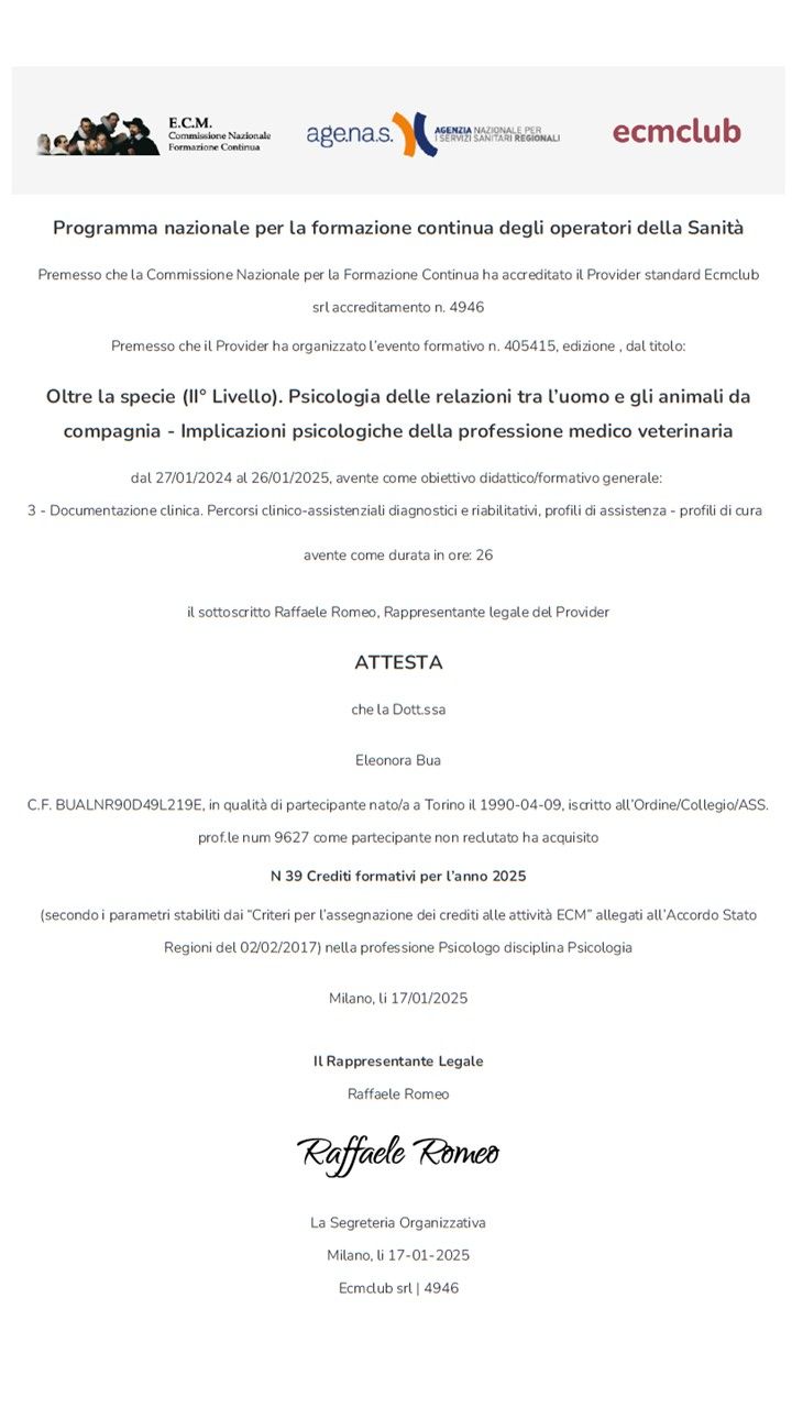 Lavoro anche in ambito veterinario occupandomi di sostegno ed elaborazione del lutto di animali e di formazione veterinaria rivolto a proprietari e operatori.