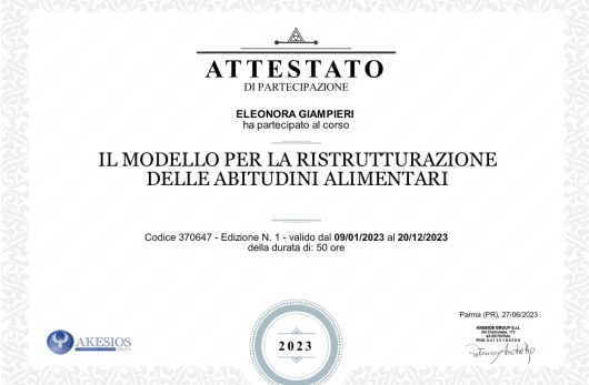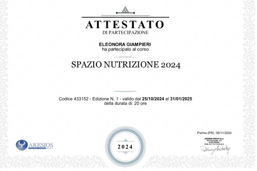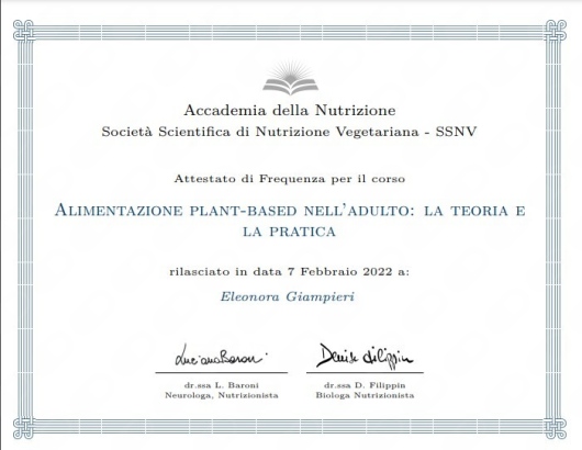 Il mio percorso è iniziato con la laurea triennale in Scienze della Nutrizione (L-24) all'Università di Urbino Carlo Bò, è proseguito poi con la laurea magistrale in Alimentazione e Nutrizione Umana (110 e lode) presso l'Università degli studi di Milano nel novembre 2013, e la scuola di specializzazione biennale in nutrizione sportiva (Sanis), acquisendo il titolo di nutrizionista sportiva.