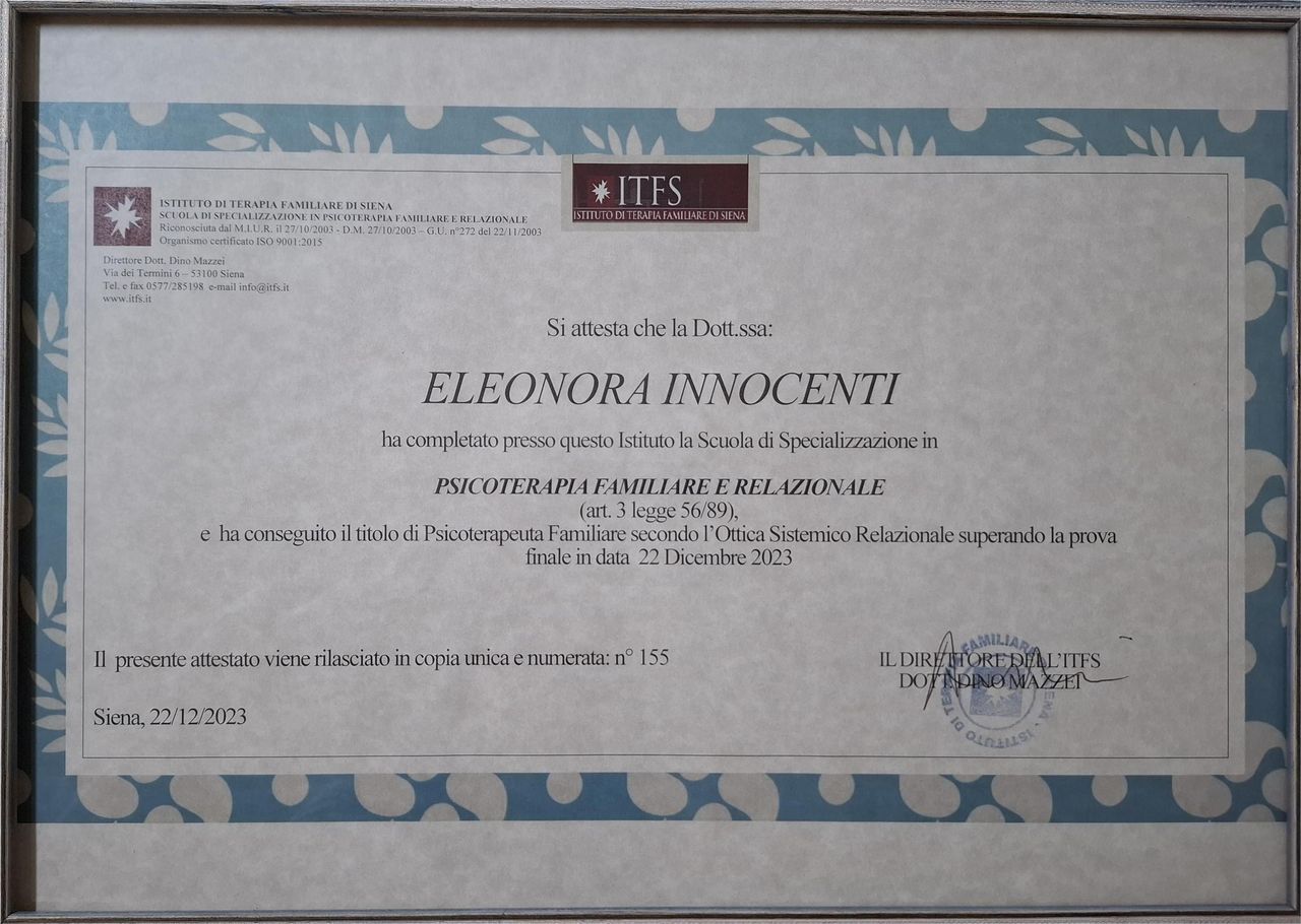 Sono la Dott.ssa Eleonora Innocenti, Psicologa, Psicoterapeuta Familiare e Relazionale.