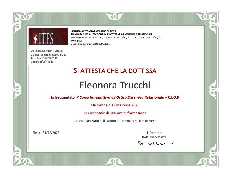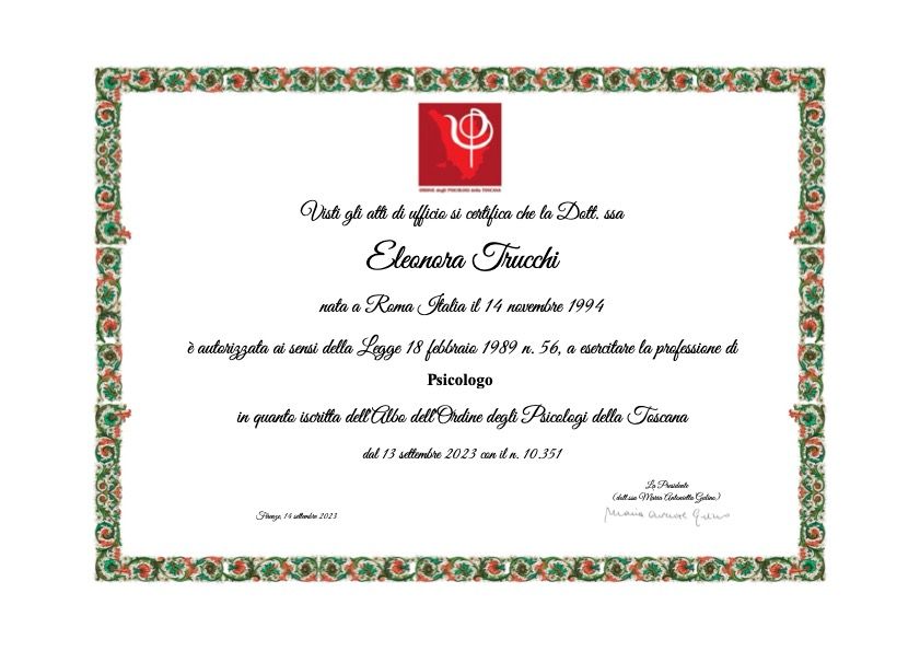 sono la dott.ssa Eleonora Trucchi, una psicologa specializzata con lode in Psicologia Clinica e specializzanda in psicoterapia presso la Scuola di Psicoterapia Familiare e Relazionale di Siena.
