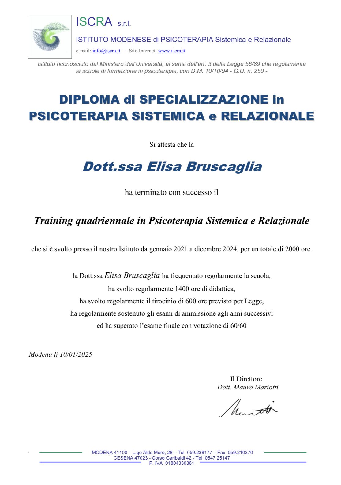 Il percorso che ho effettuato con la Dott.ssa Bruscaglia è stato per me di grande aiuto. Mi ha permesso di fare luce su molte dinamiche che mi creavano difficoltà. Inoltre, mi ha trasmesso diversi strumenti utilissimi che utilizzo quotidianamente. Sono molto soddisfatto del percorso di terapia fatto insieme. La consiglio vivamente.